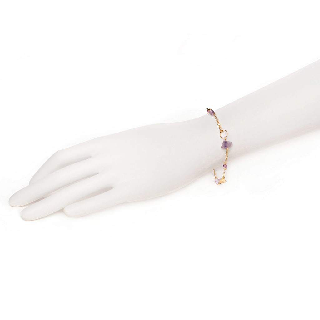 Emanate the easy elegance that this gem bestows. A dainty gold-plated chain gracefully carries amethyst stones and Austrian crystals, gleaming with diamond-cut circles and squares, radiating a refined and sophisticated charm.