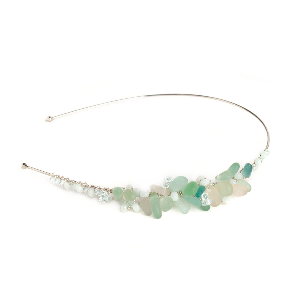 Presenting the Azure Serenade headband – a truly gorgeous piece that delights the eyes with its captivating beauty. This headband features the soothing allure of gushing beach waves, embodied in natural sea glass collected from the shores. These authentic sea glass pieces are meticulously drilled for secure attachment to a silver-plated base, creating a richly decorated accessory.