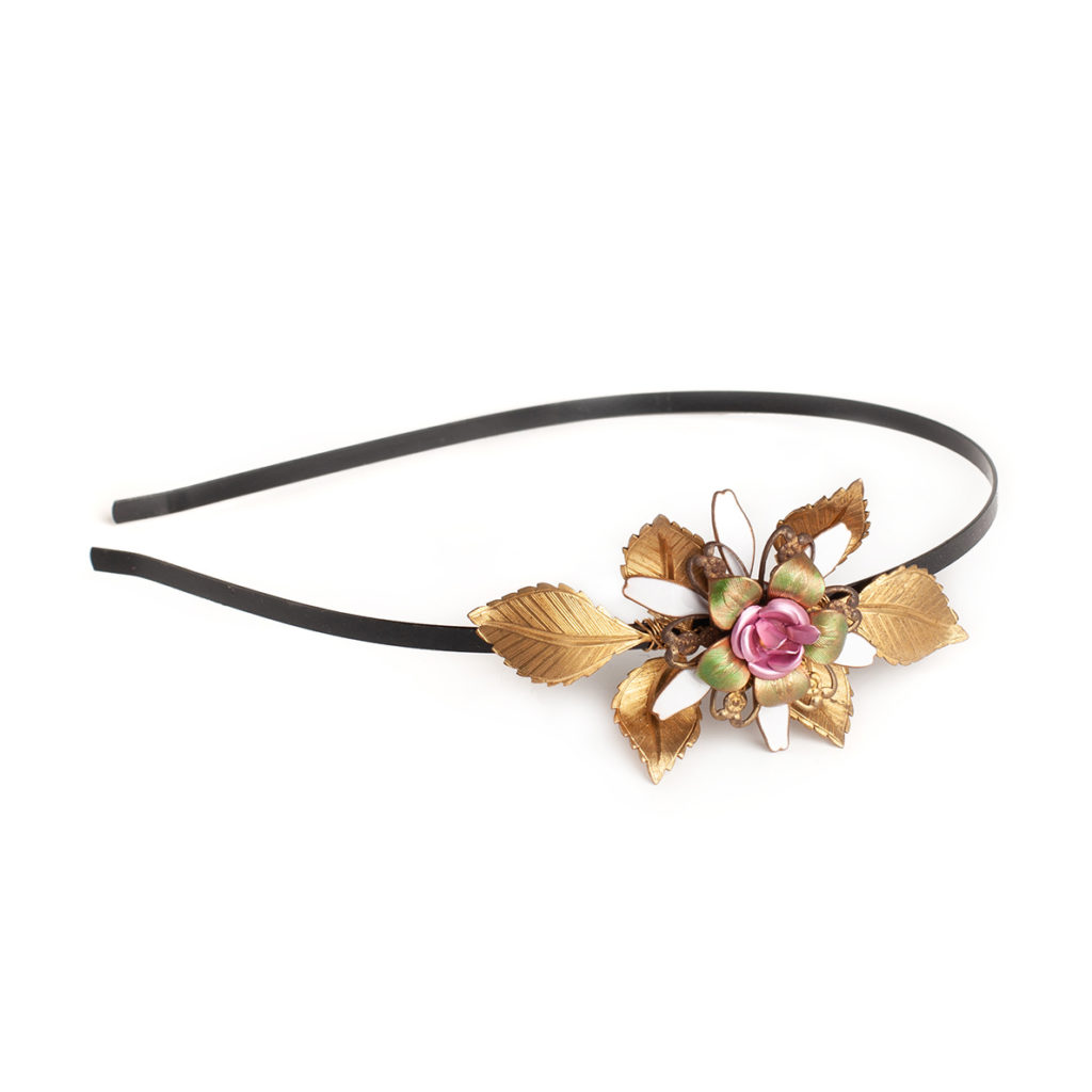 This unique headband features a lovely, small rustic flower on a flexible, adjustable black base. The antique gold-plated leaves, intricately engraved, form a charming frame for this singular flower. Crafted with four-layered filigree and adorned with an almond pearl, the flower adds a touch of bohemian rustic elegance.