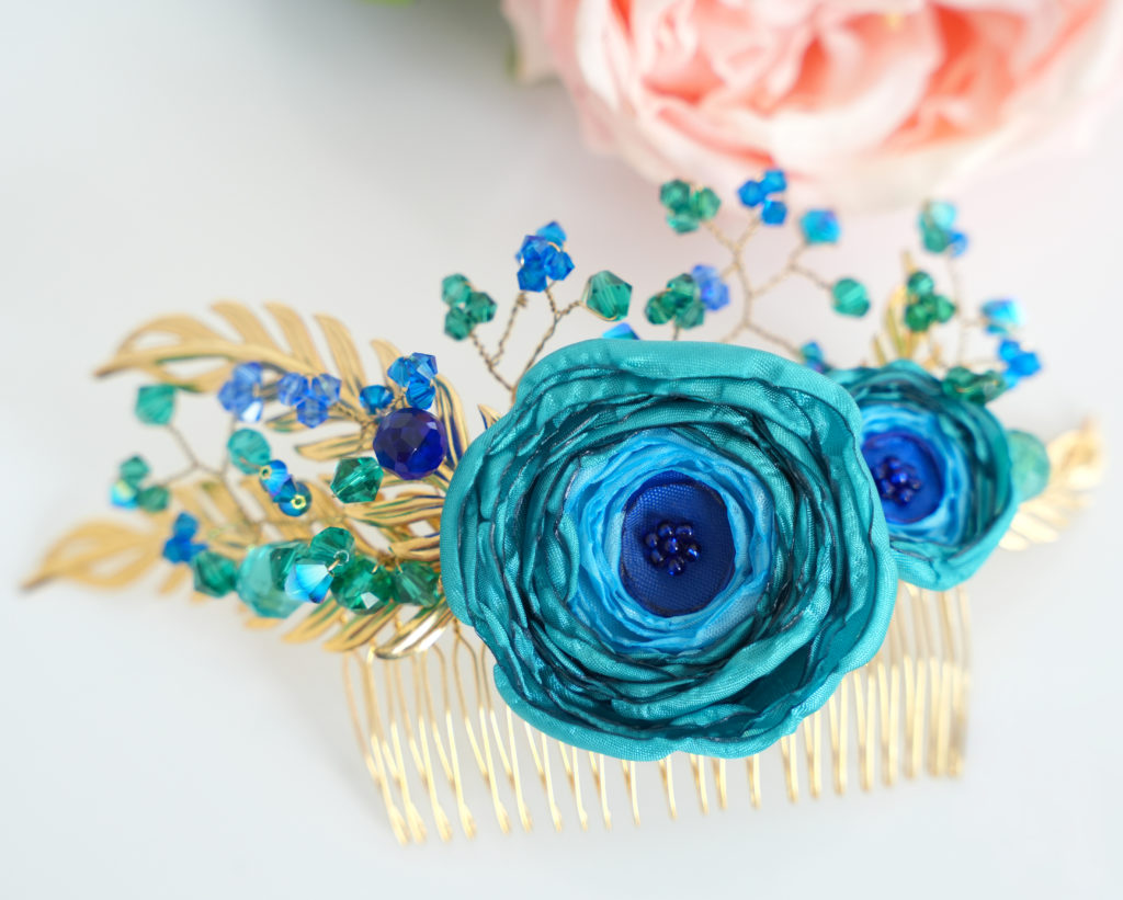 Introducing our most beloved comb: embark on a whimsical journey with our Peacock-inspired masterpiece, delicately perched upon a base of 24-karat gold-plated feathers and adorned with luxurious hues of greens and blues, courtesy of Austrian crystals.