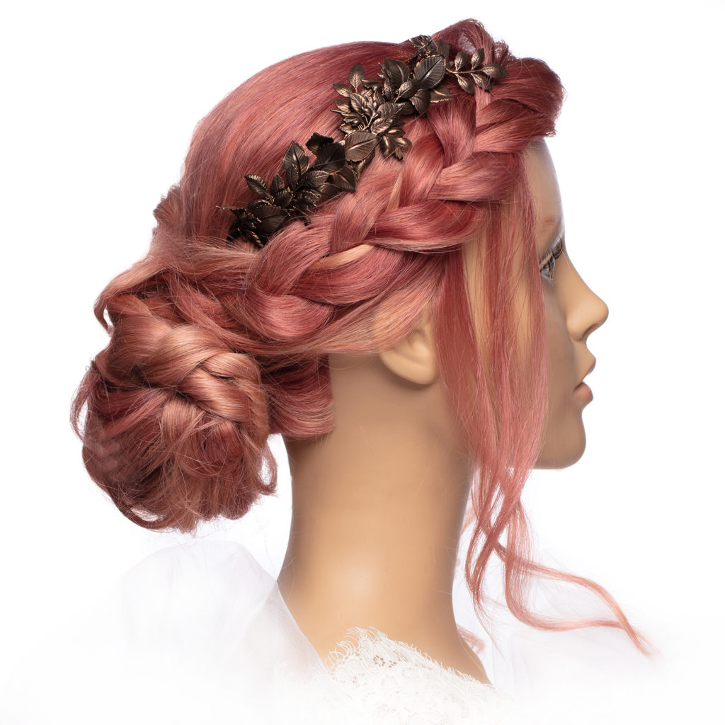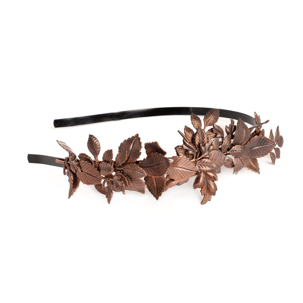 Introducing the Copper Foliage headband, an exquisite piece crafted from vintage copper-plated brass leaves. This headband possesses a distinctive personality, evoking the image of rusty autumn leaves gracefully falling around you, creating a beautiful crown as they cascade down. A half-head design allows the plain part of the headband to blend seamlessly into your hair, crafting a captivating illusion of floating leaves on one side.
