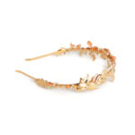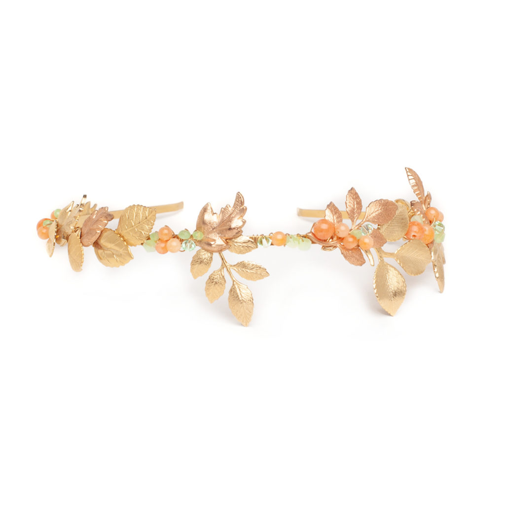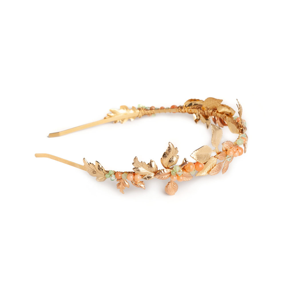 Crafted with 24-karat gold and rose gold-plated leaves, this headband radiates beauty and joy. Adorned with coral jade stones in a slightly translucent finish and embellished with Austrian crystals in chrysolite opal, chrysolite, and Czech fire-polished beads, it adds a touch of sophistication and playfulness to your look.