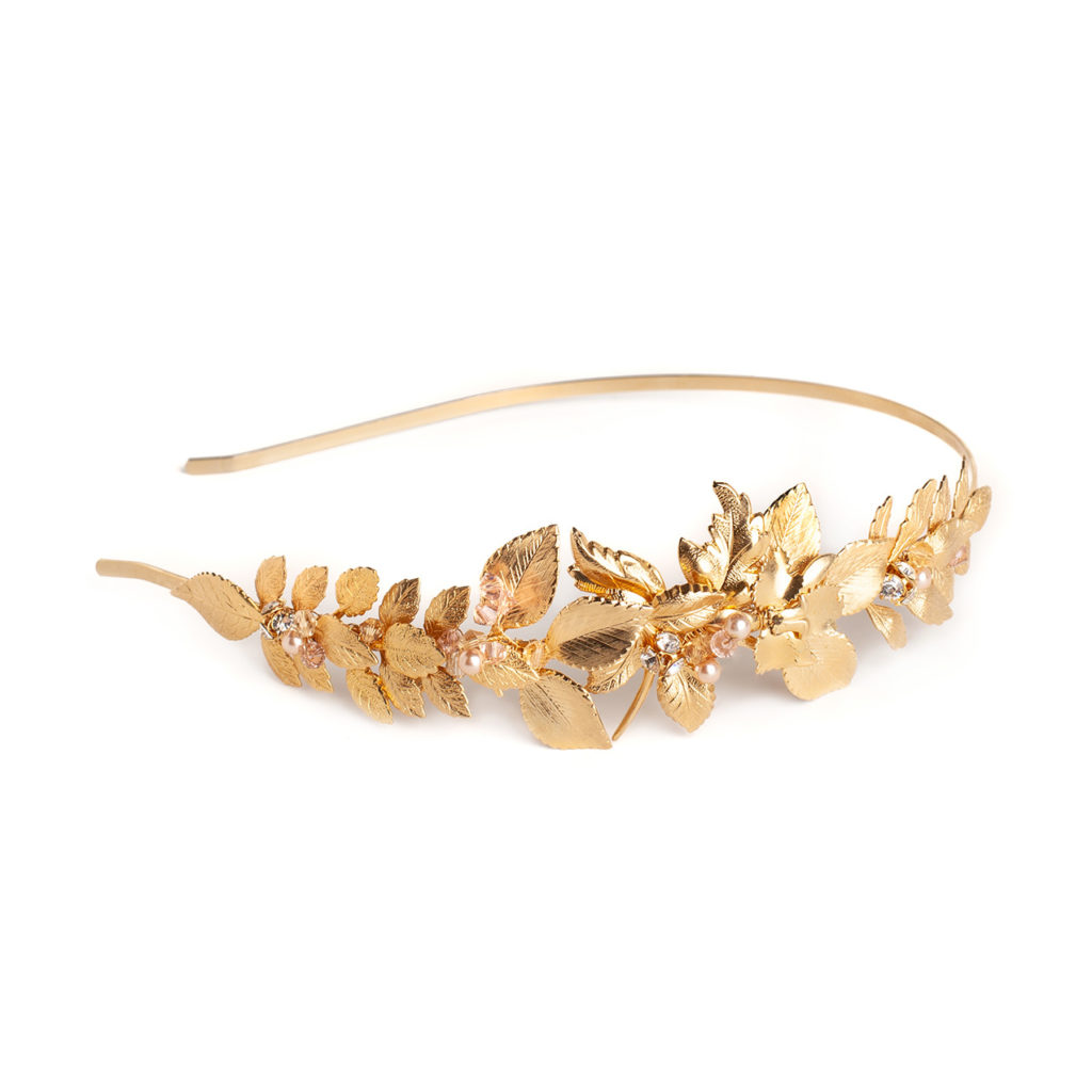 This golden headband features an abundant array of meticulously crafted gold-plated leaves, making a bold and enchanting statement. Adorning your locks are Austrian pearls in a captivating rose gold shade, paired with light rose Austrian crystals and silk crystals that gracefully complement the golden ensemble. The piece glows with an intense shimmer from Austrian crystals, their clear settings catching the sunlight and reflecting a mesmerizing radiance in your hair.
