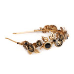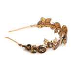 This bestseller boasts an empowering and unique combination of black and gold. The headband features antique gold plated leaves that enhance black and gold coin buttons adorned with a medieval coat of arms theme. The design is further enriched by a rich spectrum of Austrian crystals, beads, drops, metal dicks, rivolis, and gems.