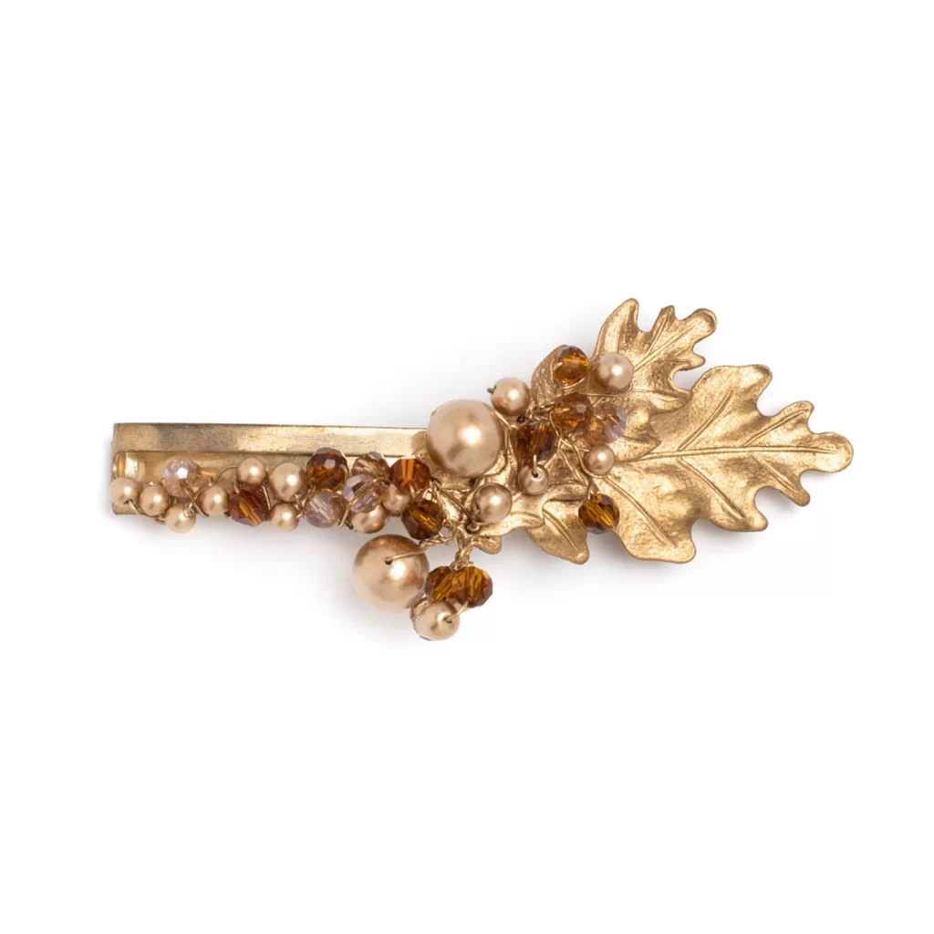The Golden Oak Barrette features a dazzling array of Austrian crystal pearls in earthy tones such as topaz, silk, and light Colorado topaz. These are further accentuated by vintage gold Austrian pearls, adding a touch of classic elegance. To complete the look, opal crystals are included, imparting an ethereal refinement that echoes the enchanting allure of autumnal landscapes.