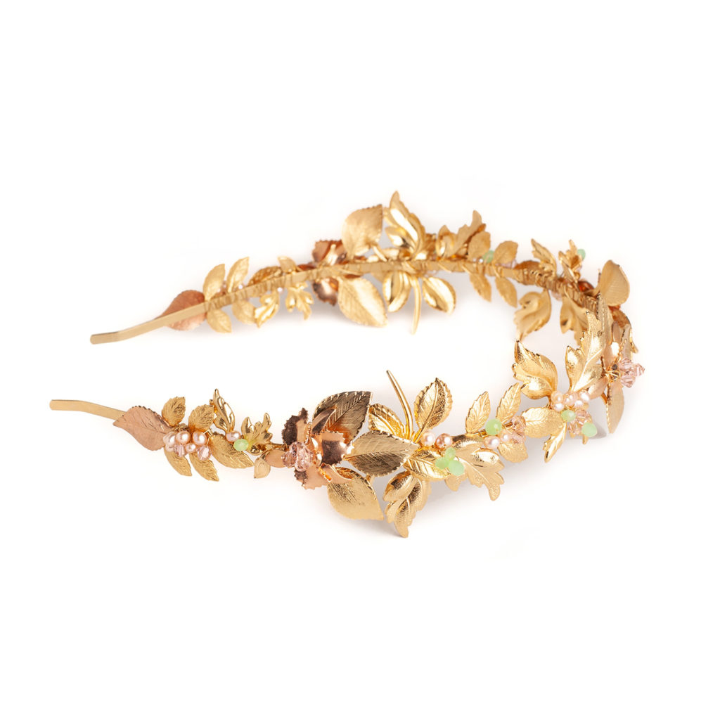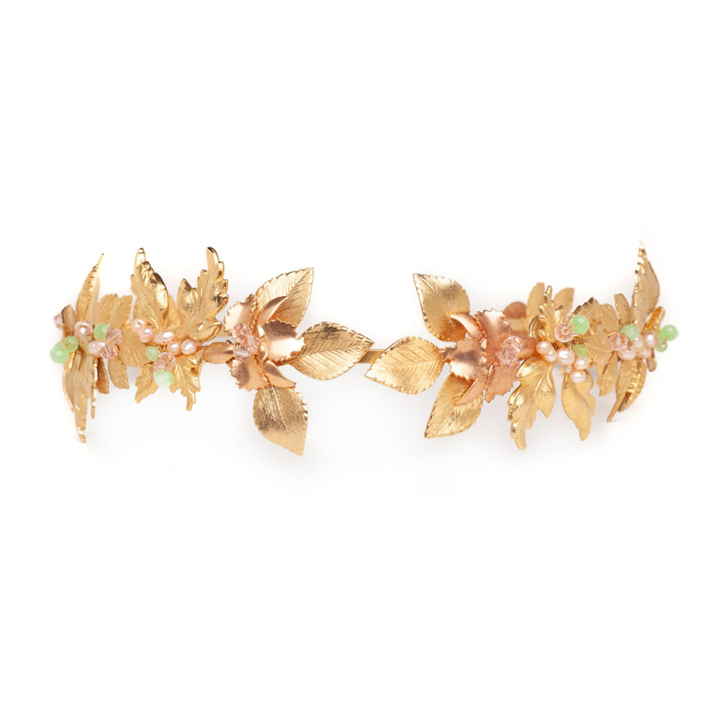 The headband is a masterful composition, boasting six distinct leaves in 24k gold plating, totaling 20 exquisite pieces, accompanied by the graceful presence of four rose gold-plated orchids. Elevate any day into an extraordinary, dreamy experience with this captivating and intricately crafted accessory.