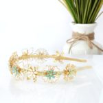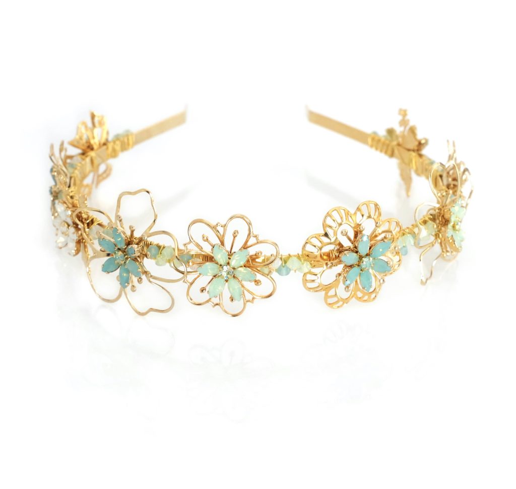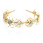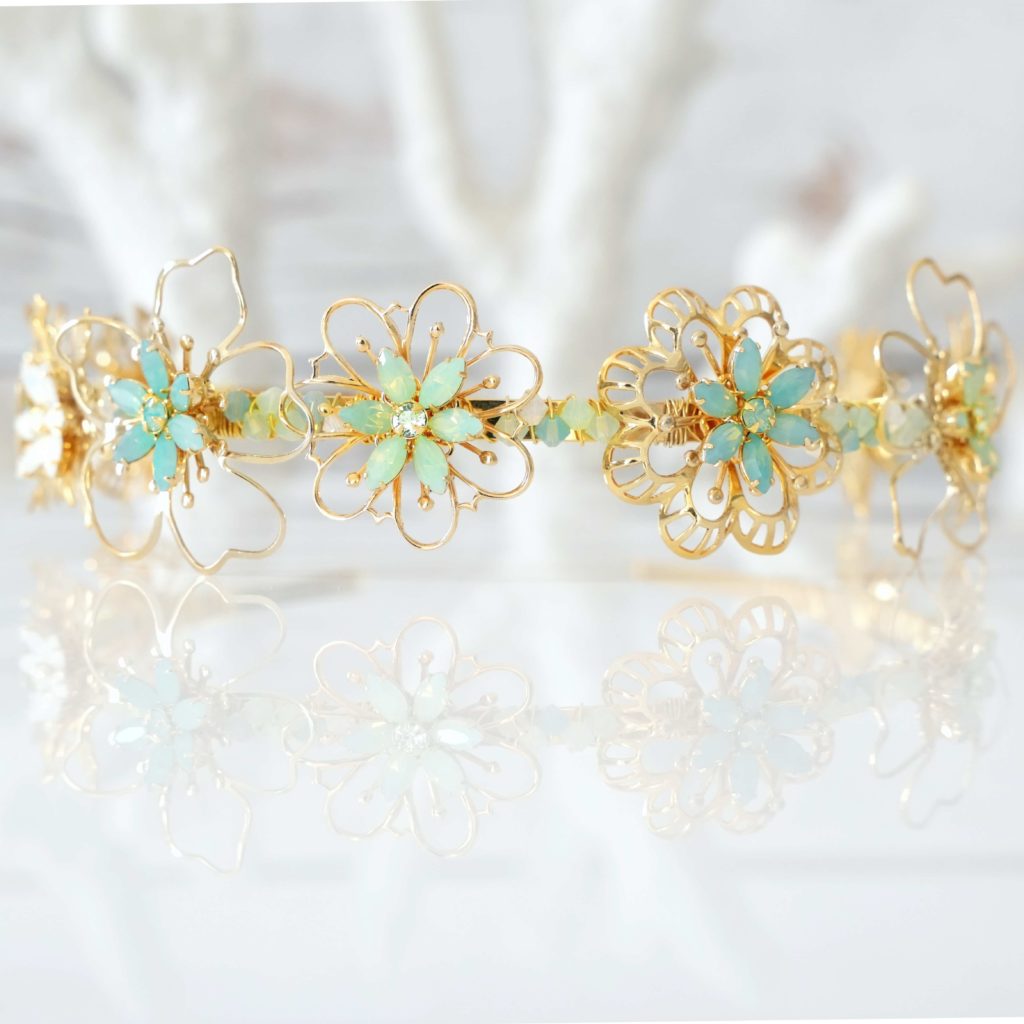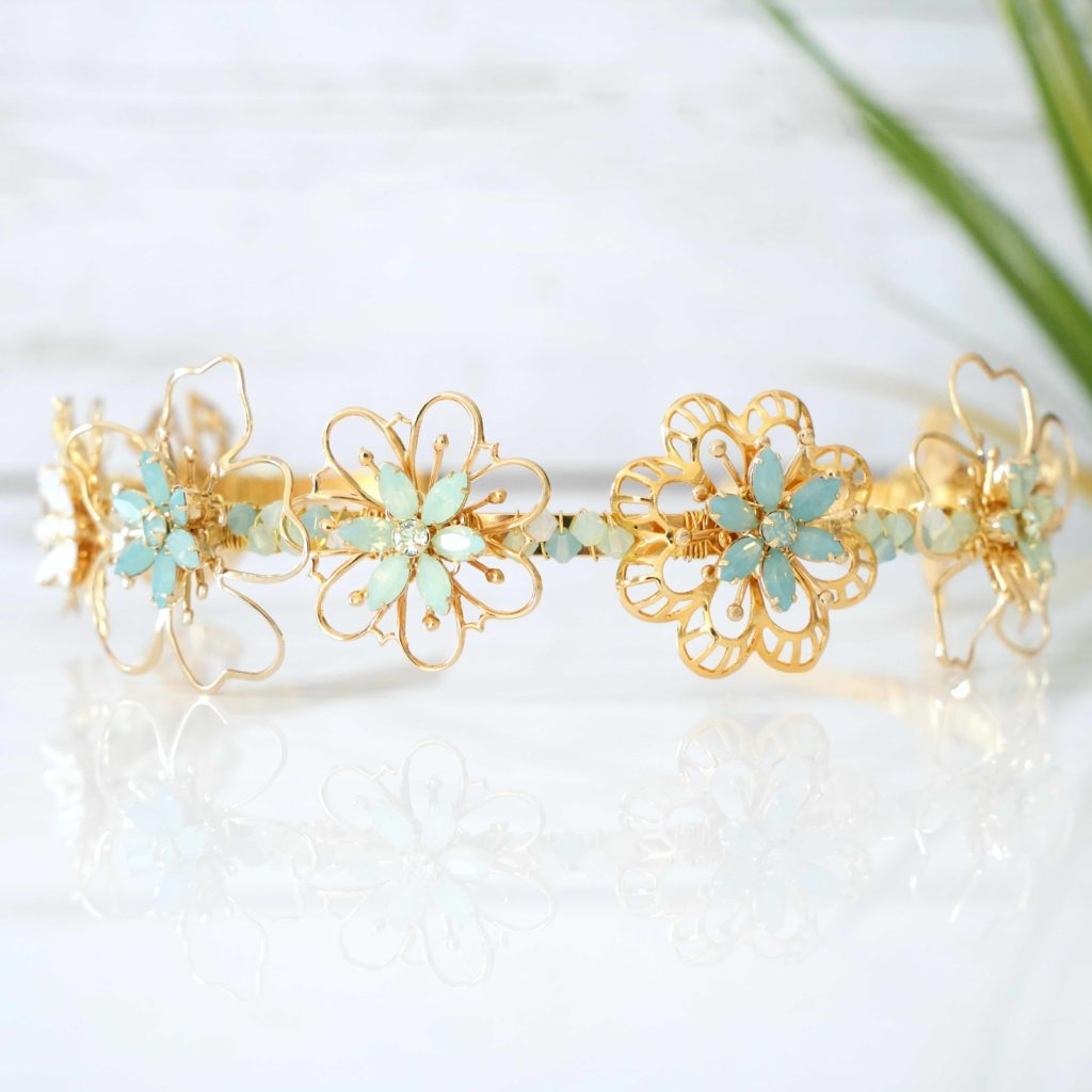 Adorned with delicate gold flower filigrees that seem to float effortlessly, the headband introduces sea-foam ombre, evoking the gentle caress of ocean waves upon the shore. The pastel blues, reminiscent of the sky and beach, infuse an elegant and whimsical charm, lending an ethereal quality to this accessory.