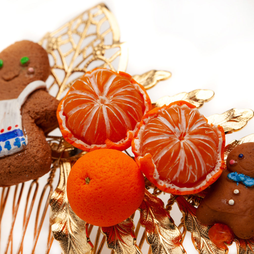 Featuring endearing gingerbread figurines and sweet mandarins, this comb is a unique celebration of holiday joy.