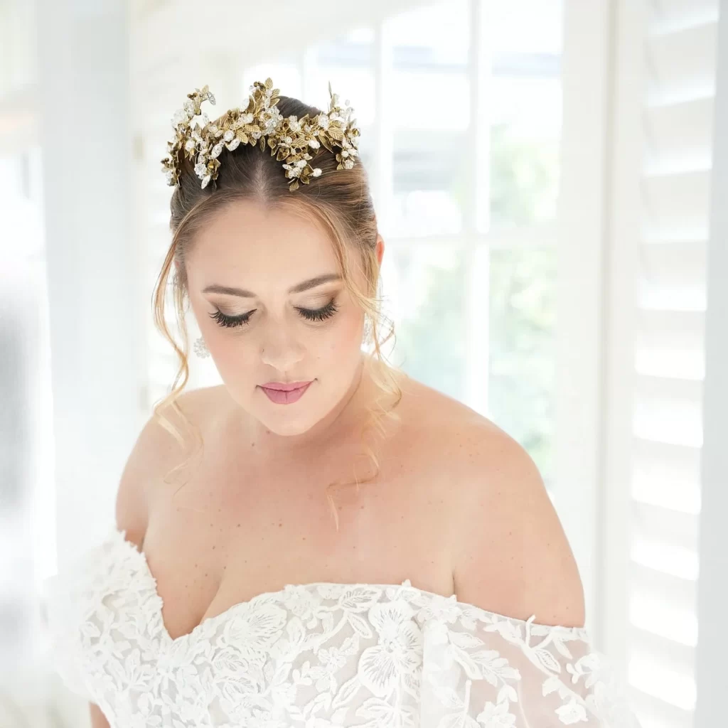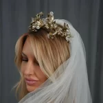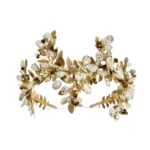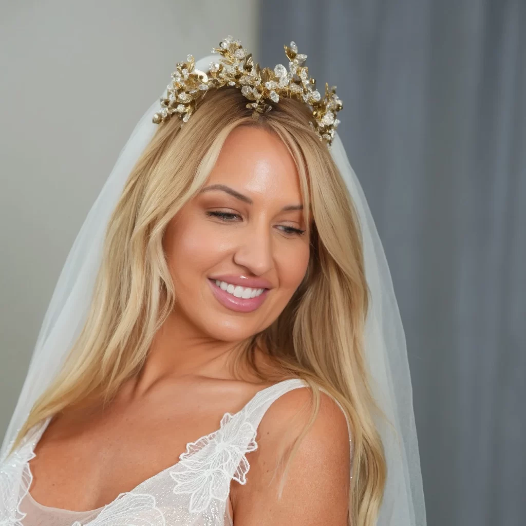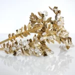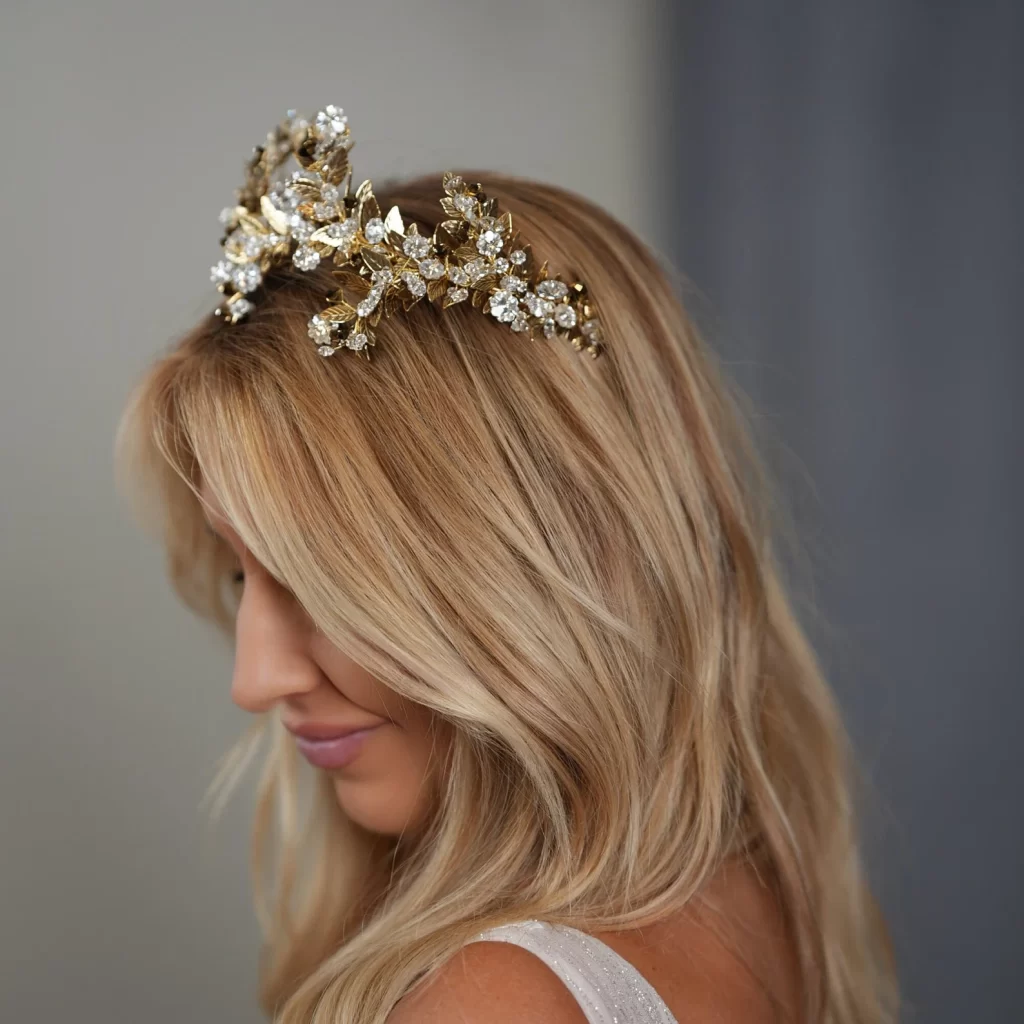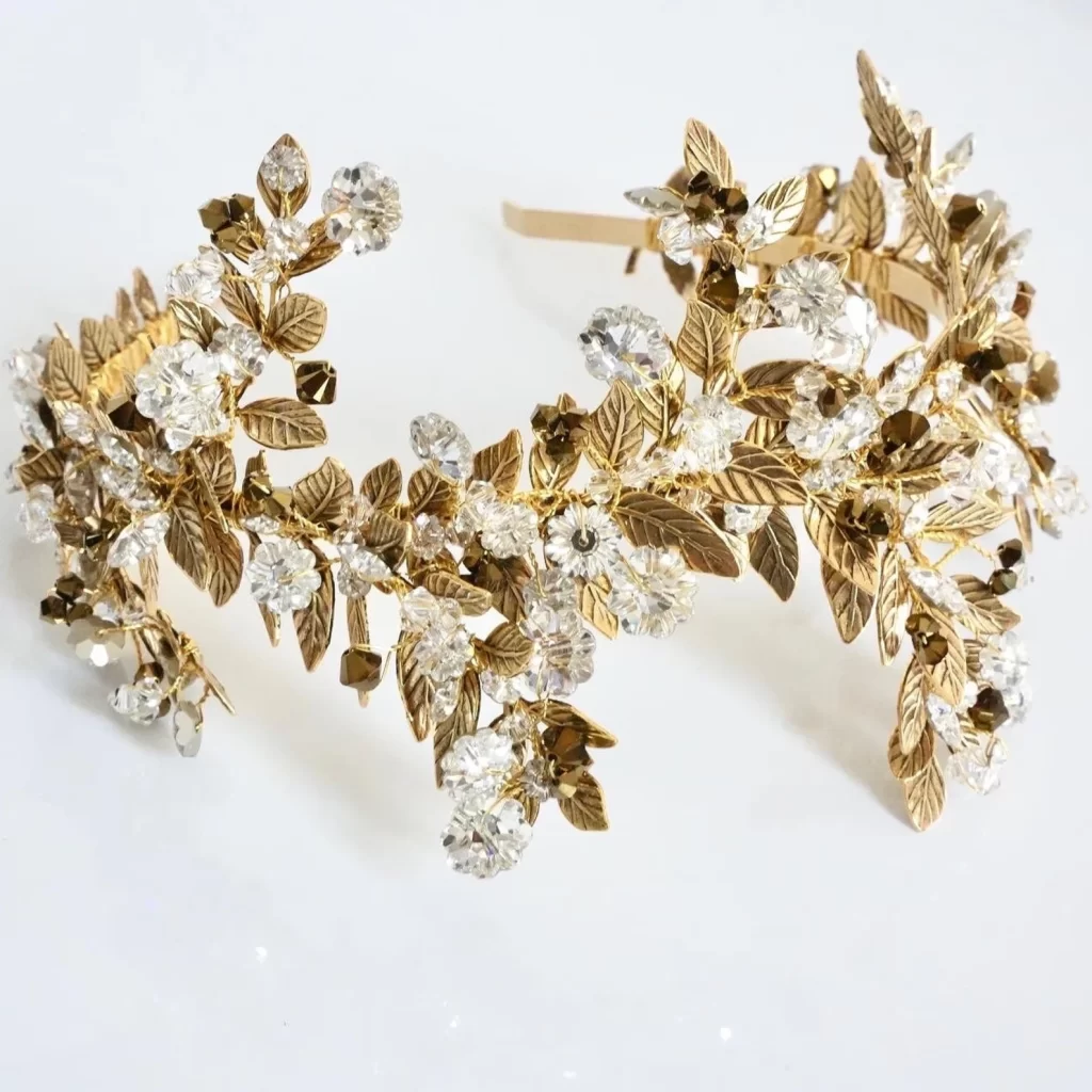 Presenting the "Imperial Grace Crown," a mesmerizing work of art adorned with intricately engraved antique gold-plated leaves and countless Austrian crystals, forming an enchanting symphony of brilliance. This opulent and versatile crown transcends traditional notions of beauty, serving as a majestic statement piece that effortlessly transforms into a crown, tiara, or headband to suit any occasion, from bridal elegance to a show-stopping accessory for galas or balls.