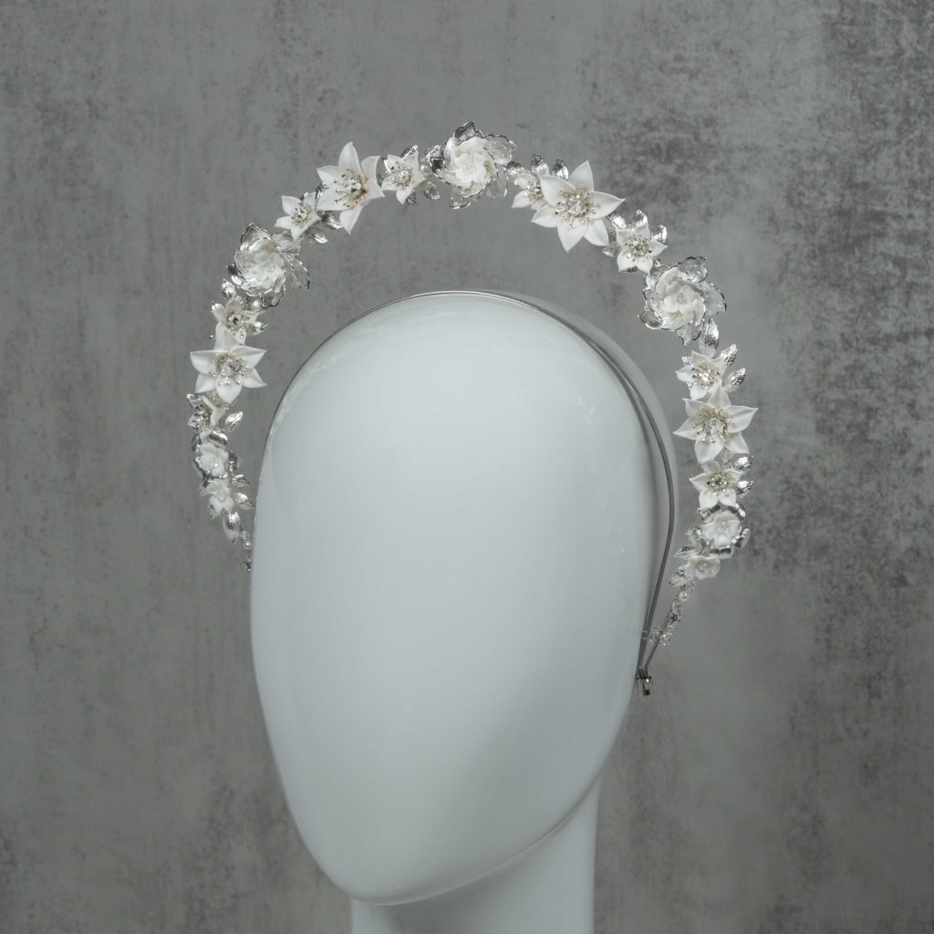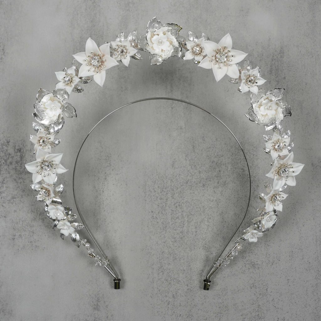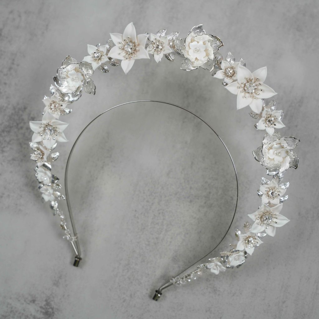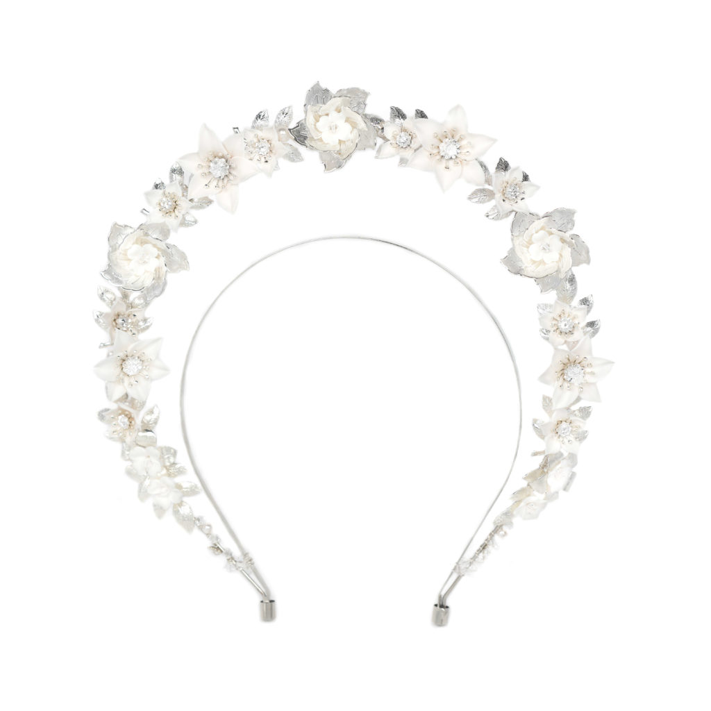 The crown radiates in sterling silver plated floral and leaf findings, casting an irresistible charm. The intense yet delicate sparkle is born from the brilliance of Austrian crystal margarita flowers, Austrian bicone crystals, and pearls. The clear lower headband seamlessly integrates into your hairstyle, creating the illusion of a floating halo—a touch of classy, romantic allure.