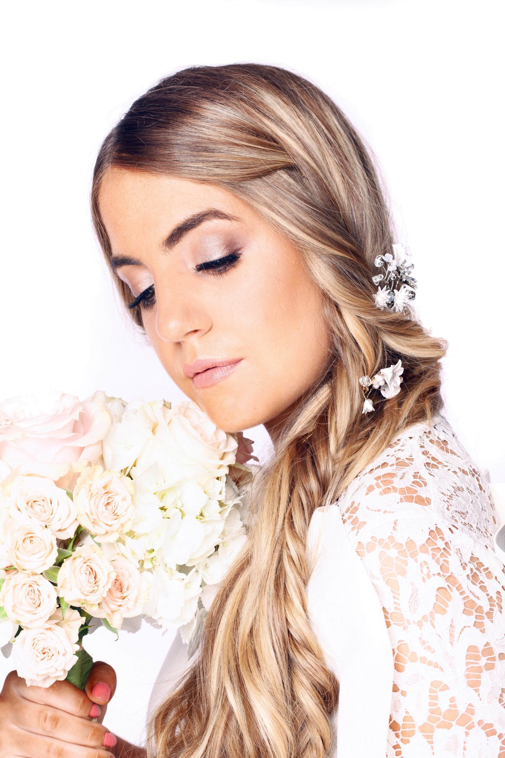 A floating bouquet of Austrian crystals and peals meets Czech fire-polished beads all complimenting delicate white flowers and a leaf. Airy lightweight adornment adds a splash of dazzle to any hairstyle.