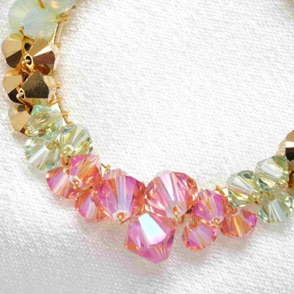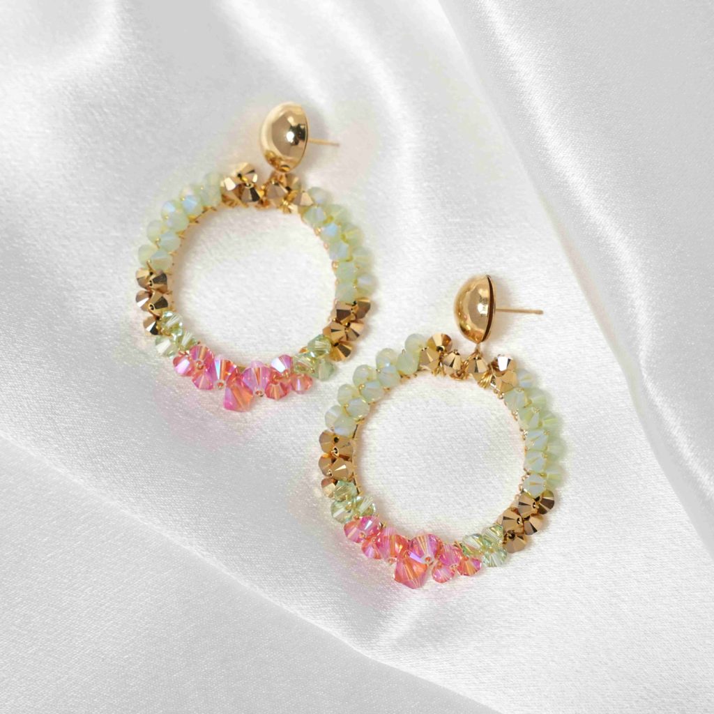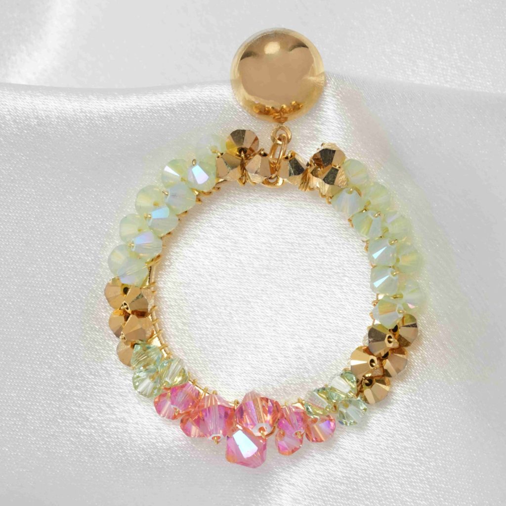 These exquisite handcrafted earrings are not just beautiful but also infuse your look with a vibrant, joyful spirit. Radiating captivation and luminosity, they feature an abundance of Austrian crystals in enchanting shades of chrysolite opal, greenish chrysolite, pink, and gold.