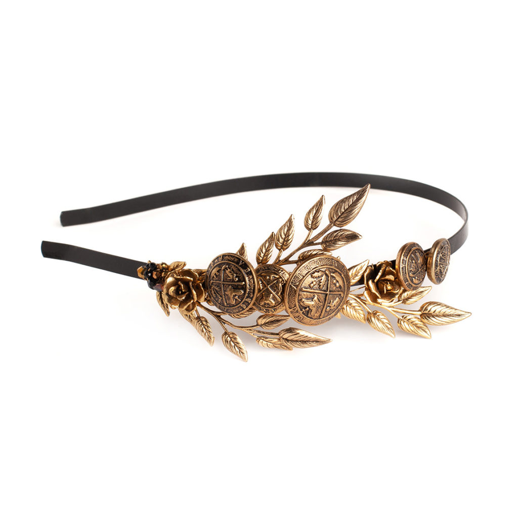 From a private collection, these coin buttons vary slightly in each made-to-order headband, yet all feature a regal selection. The buttons, leaves, and roses are plated in an antique gold finish, ensuring a touch of royalty. This high-quality, durable headband is adorned with Czech fire-polished beads, adding a subtle shimmer to the base of the cluster. Uniquely powerful yet petite, the flat part of the headband can be effortlessly styled into your hair, creating the illusion of floating leaves and coins—a truly distinctive piece that embodies both strength and delicacy.