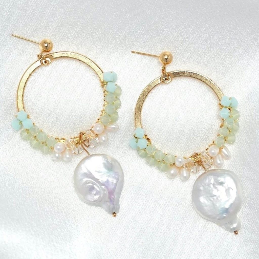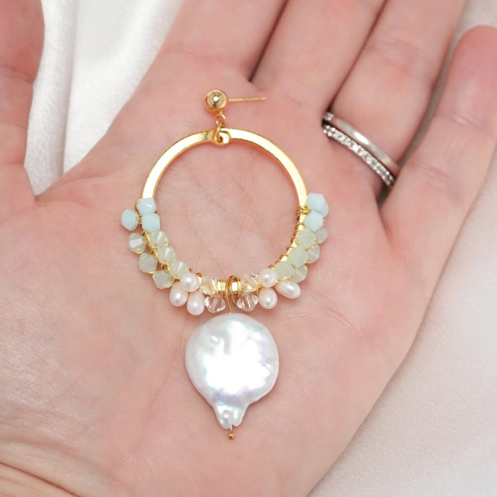 Introducing the Mint Oasis Loop Earrings, a pair of statement earrings designed to captivate on any occasion. Radiating timeless elegance and sophistication, these eye-catching treasures feature a large coin freshwater pearl adorned with a luminescent coat, creating an aura of ethereal beauty. Perfect for bridal elegance, these earrings incorporate elements of "something blue" with mint alabaster, chrysolite opal, and clear Austrian crystals. Delicately framed by dainty freshwater pearls, the centerpiece pearl is a testament to uniqueness and refinement.