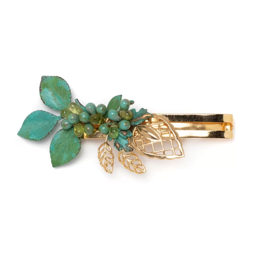 Unveiling our Mossy Meadow Barrette, a masterpiece in verdant green that harmonizes the allure of nature with the sophistication of artisanal design. Each piece is meticulously crafted with a blend of care and creativity, highlighted by handcrafted verdant green patina leaves alongside contrasting 24-karat gold-plated foliage. This exquisite barrette is a unique fusion of hues and textures, making every piece one-of-a-kind.
