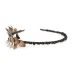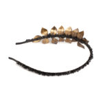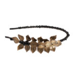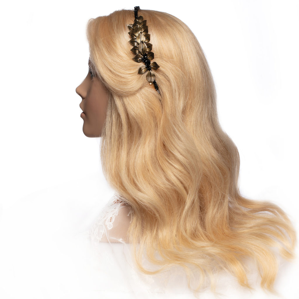 Presenting the Noir Elegance headband, a truly special accessory adorned with deep, rich jet black crystals in briolette, cube, and bicone shapes. The headband is bedazzled with these shining black crystals, creating a mesmerizing effect. On one side, six triple leaves add an extra layer of handmade elegance, crafted through a meticulous patina process that ensures enduring beauty. This headband is not just gorgeous; it's mysterious, versatile, and possesses a distinctive personality. Its eye-catching allure makes it a beautiful conversational piece, leaving a lasting impression with its stunning and unique design.