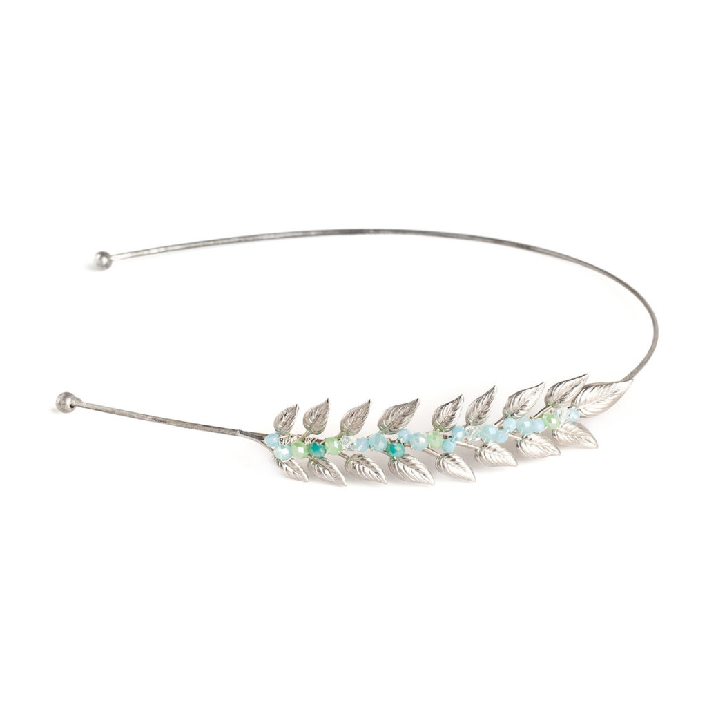 The ocean-inspired hues range from azure to opal blues, opal greens, and deep oceanic greens. Despite its small size, this headband makes a beautiful and delicate statement. Implement the flat sides into your locks to create the illusion of a floating leaf spray, carrying the essence of the ocean with you wherever you go. "Ocean Whispers" is a delicate, feminine, mermaid-like accessory that seamlessly pairs the leaves of nature with the dreamy droplets from your beach getaway.