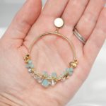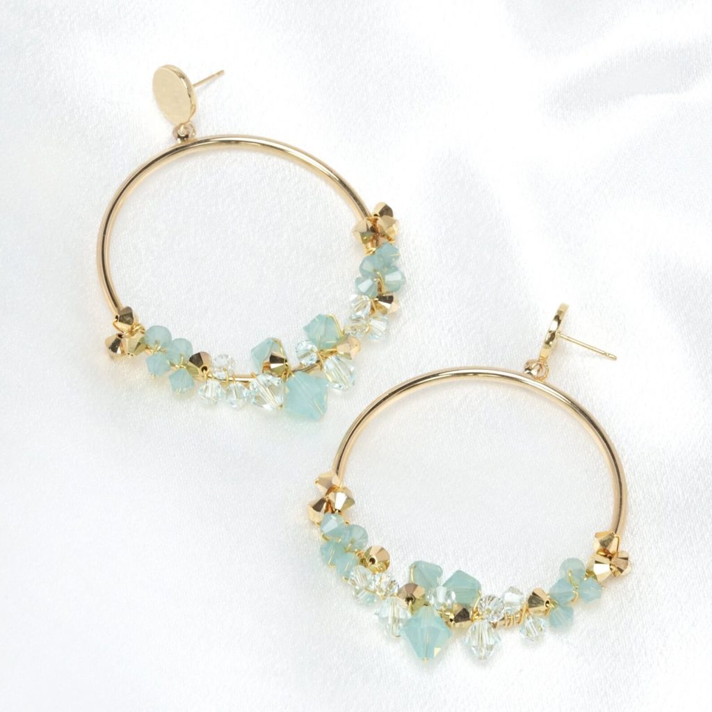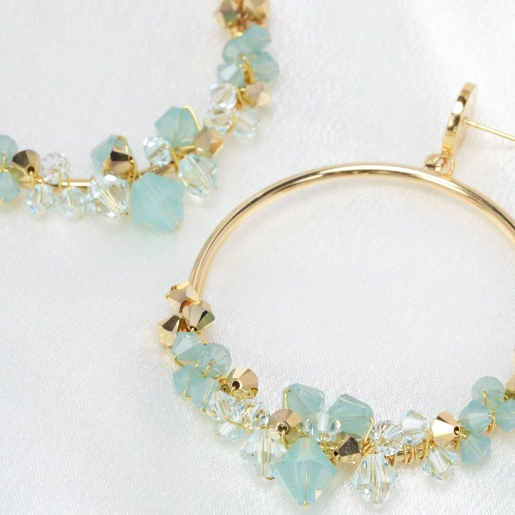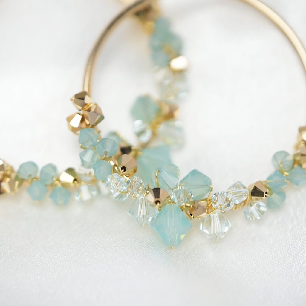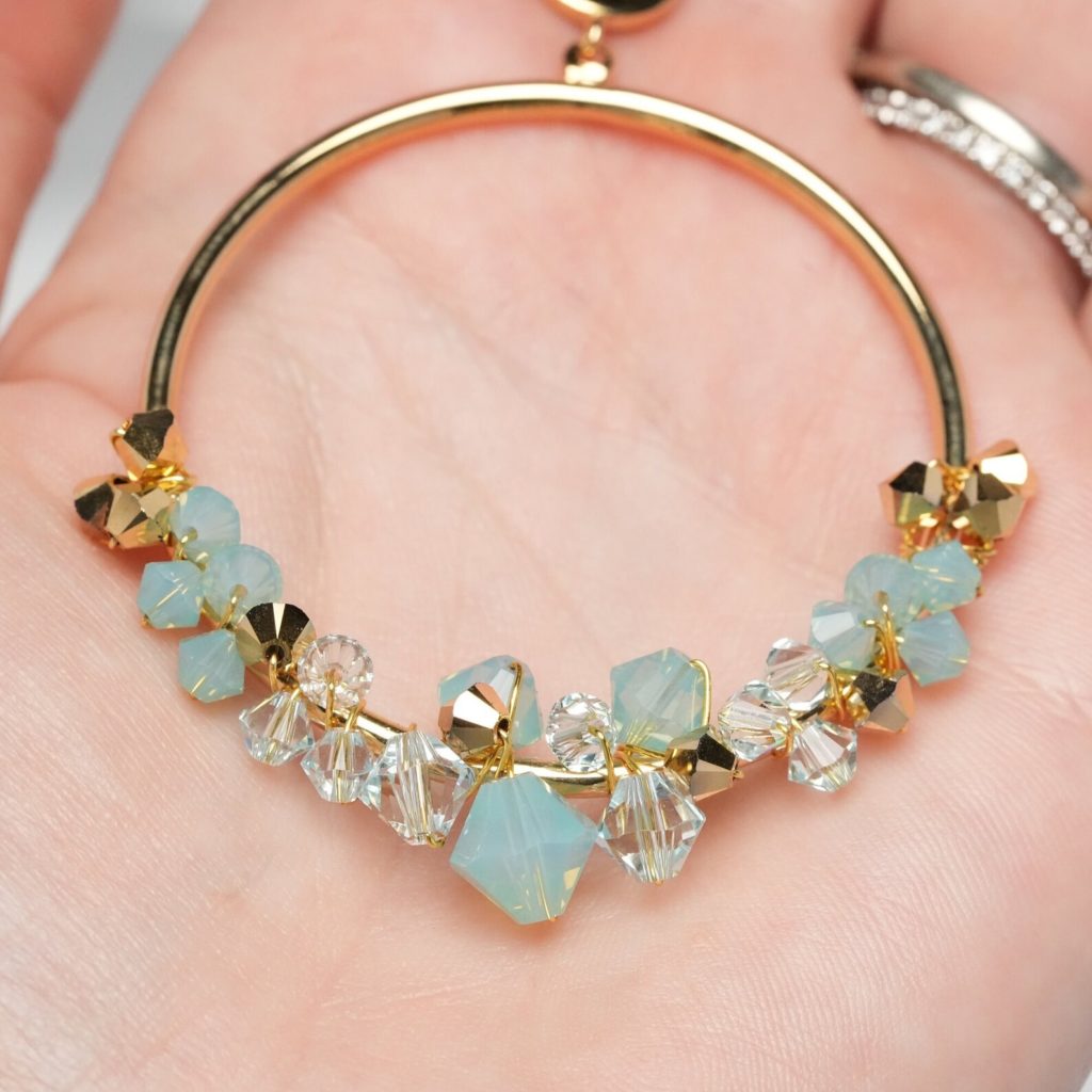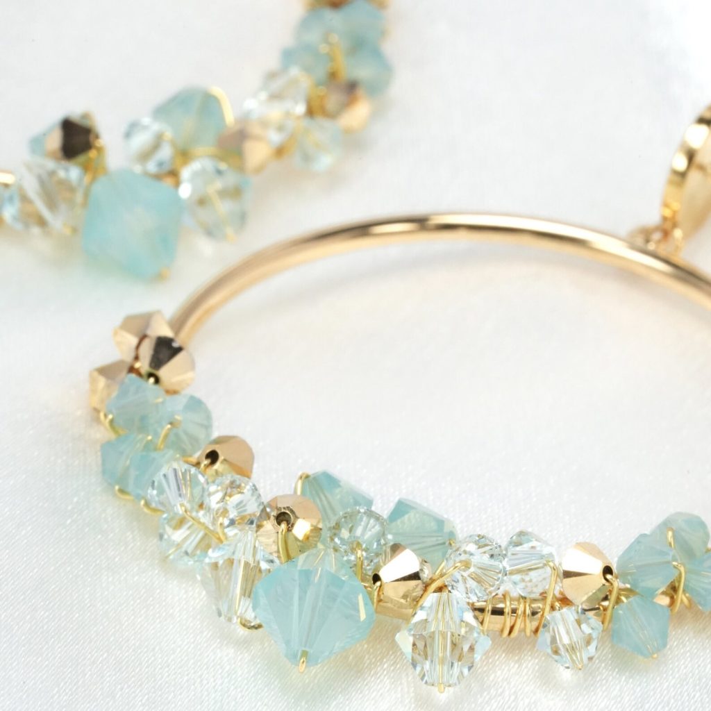 Picture yourself seated on the beach, where the radiant sun casts a captivating shimmer over the dunes, and the waves crash onto the shore in mesmerizing shades of blue. Drawing inspiration from the serene allure of Siesta beaches, these striking statement earrings encapsulate the essence of this breathtaking scenery. Created with meticulous attention to detail, they showcase a delicate arrangement of light blue, pacific opal and gold Austrian crystals intricately hand-wired onto a 24-karat gold-plated loop.