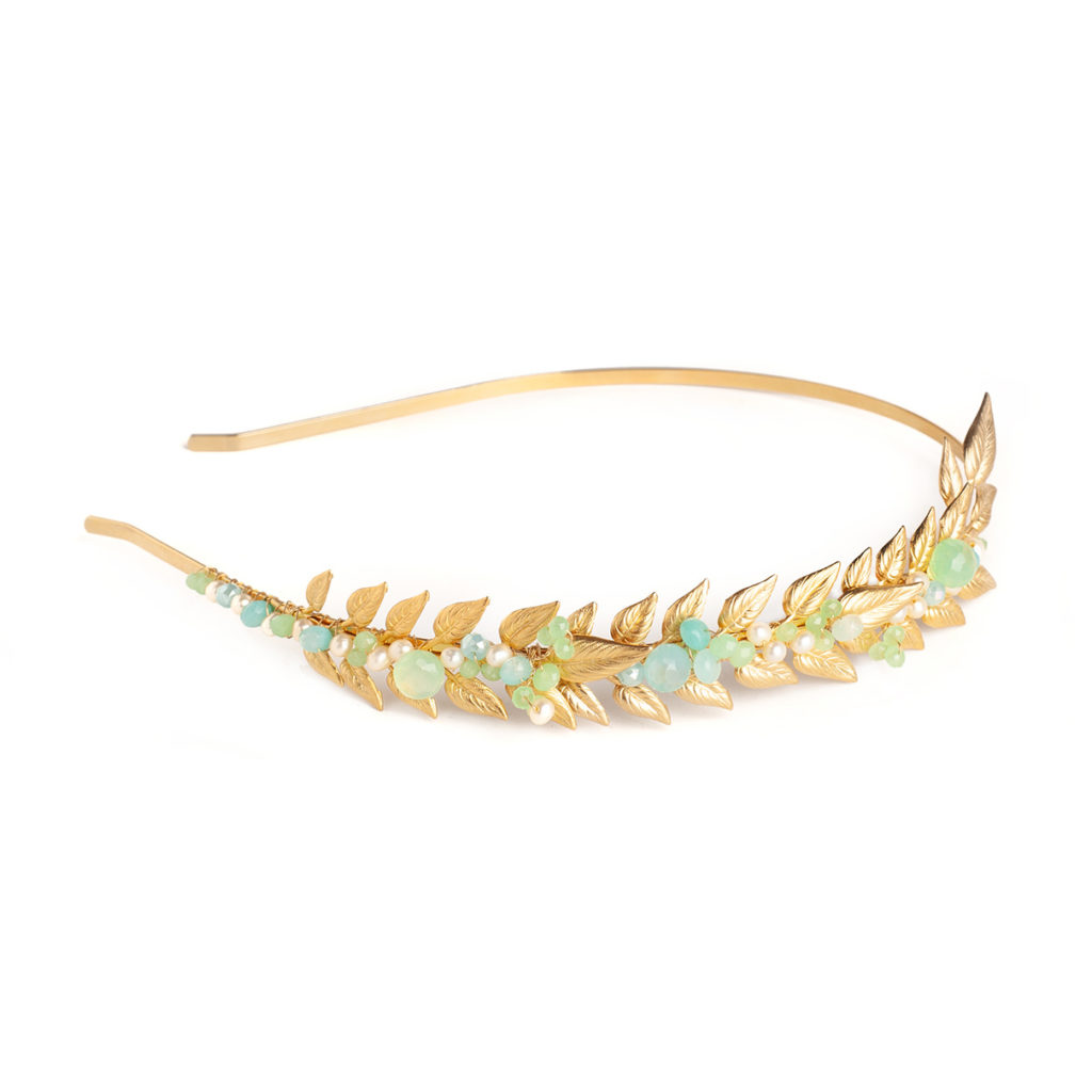 Embrace the enchanting allure of summer with this lovely and delicate headband, where coastal vibes gracefully dance across a stunning gold base adorned with meticulously crafted gold leaves. This homage to summer radiates with opulent greens and blues, featuring radiant stone briolettes in opal colors that capture the essence of the seaside.