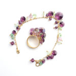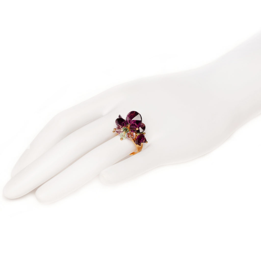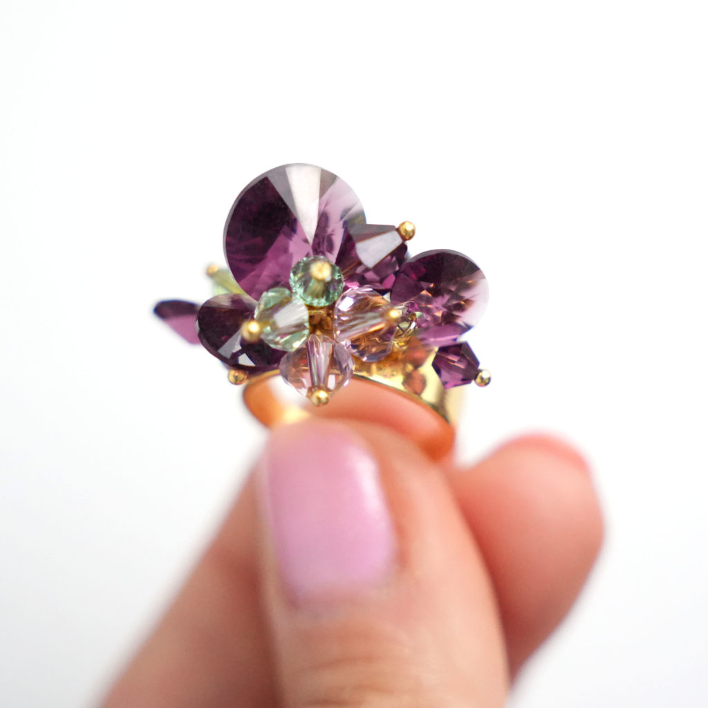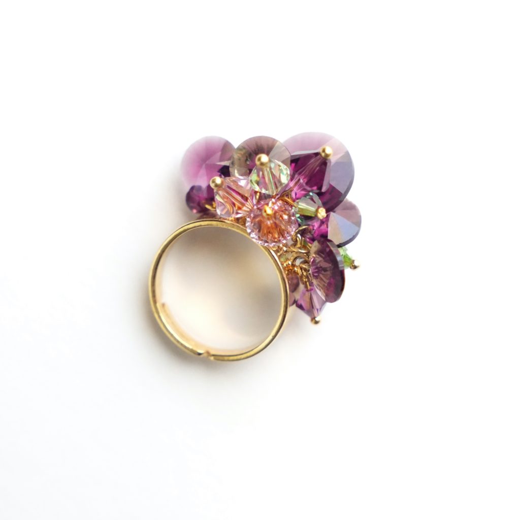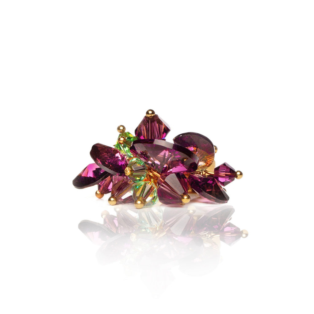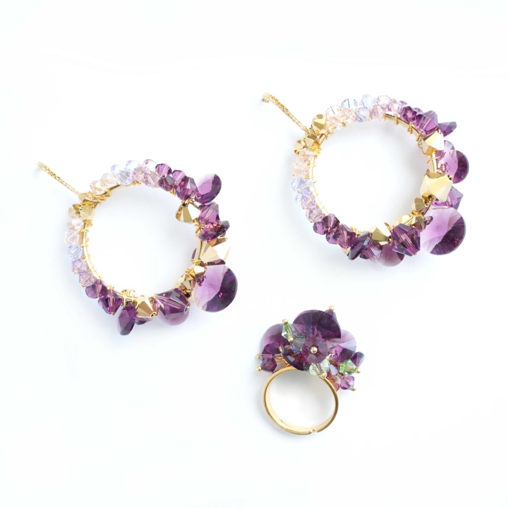 In the realm of elegance and charm, the sparkling and edgy Austrian crystal rivolis take center stage, casting a mesmerizing allure with their beautiful amethyst and peridot green shades. Each meticulously handmade piece is a testament to the artisan's skill, ensuring that it not only catches the light but also captures the essence of mystique. Amethyst, with its deep purple hues, holds a magical significance in jewelry. This enchanting gemstone has long been associated with spiritual wisdom, heightened intuition, and a sense of calm. Wearing amethyst becomes a transformative experience, allowing the wearer to carry a piece of this mystical allure and tap into the unique energies it imparts.