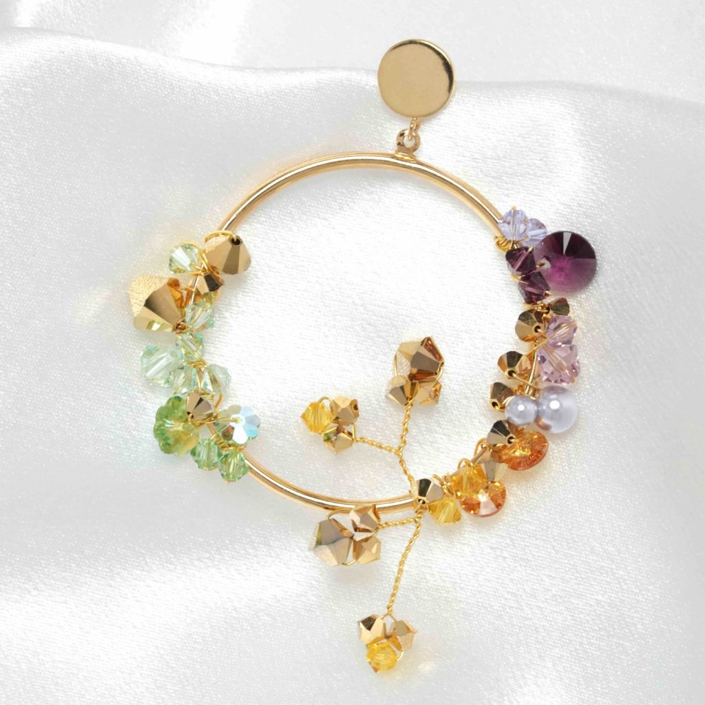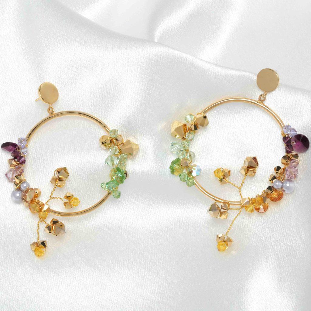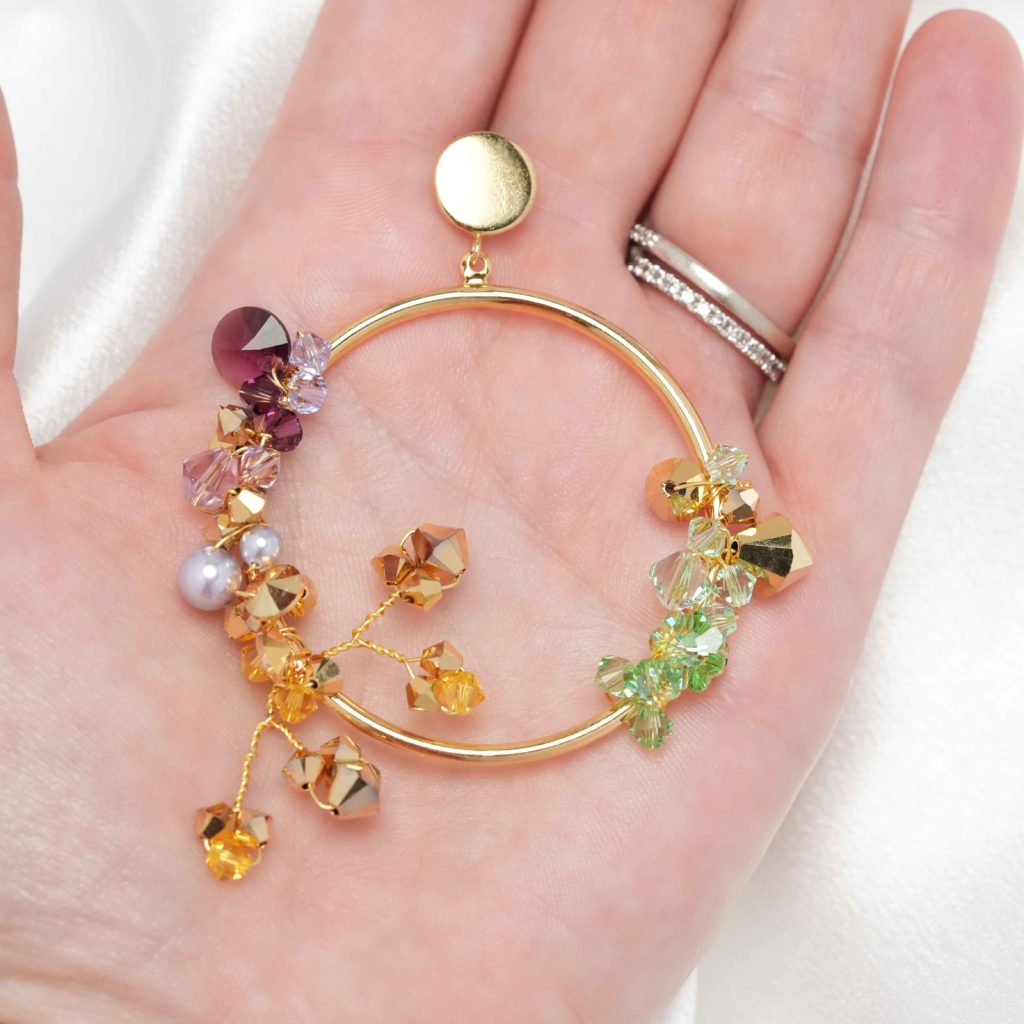 These handcrafted earrings are adorned with exquisite Austrian crystals, including rivolis and pearls, all meticulously hand-wired onto stunning 24-karat gold plated loops.