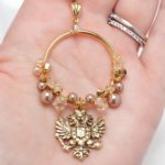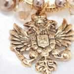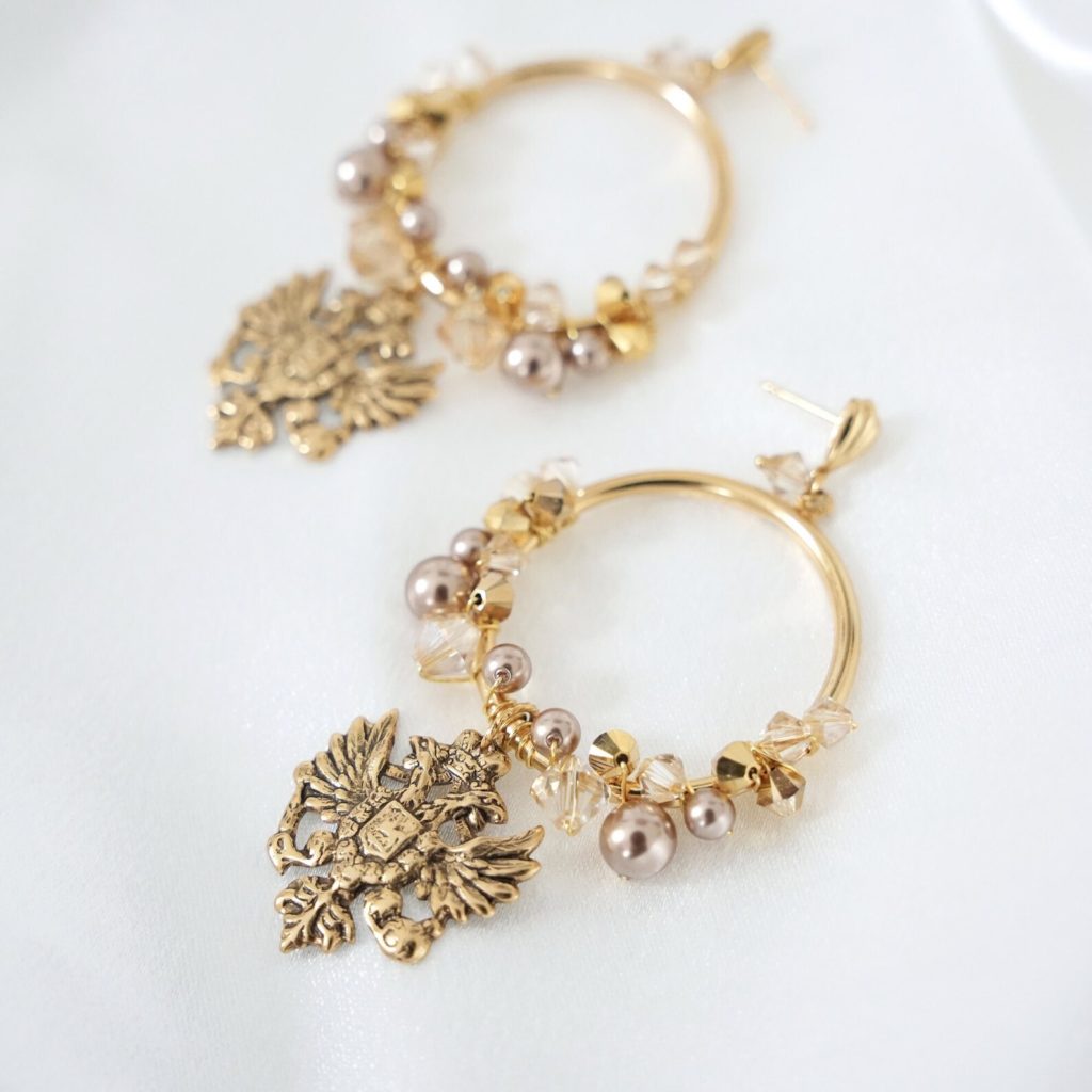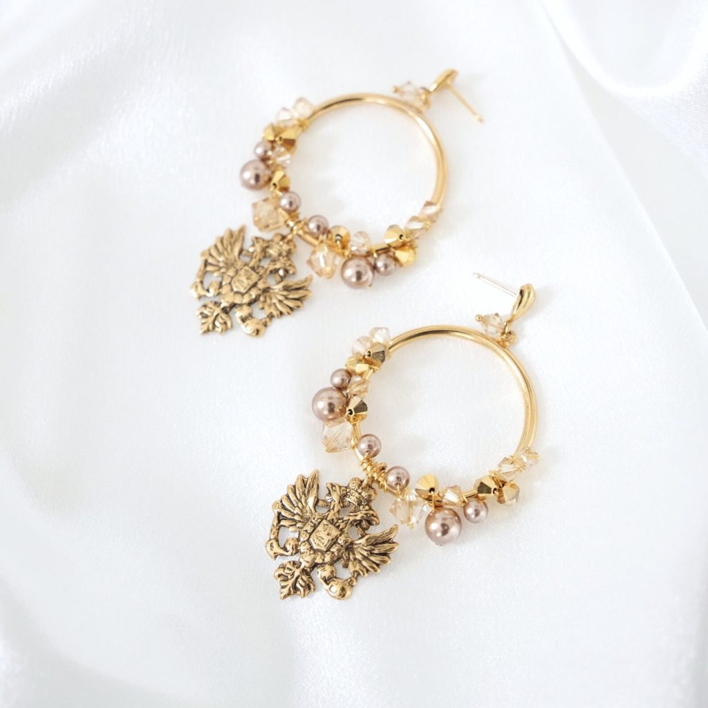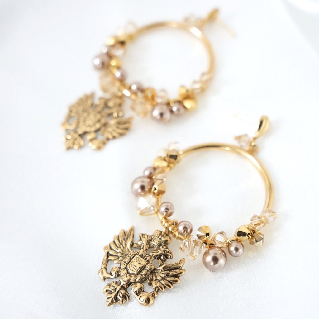 Step into a regal ambiance with these stunning vintage motif earrings. Adorned with Austrian crystals and Austrian pearls in earthy tones, they exude timeless elegance. Austrian crystal pearls in bronze pearl harmonize with Austrian crystals in beautiful shades of light colorado, topaz, silk, and gold. Suspended from medium-sized loops are majestic regal eagles, plated in antique gold, adding a touch of historical charm.