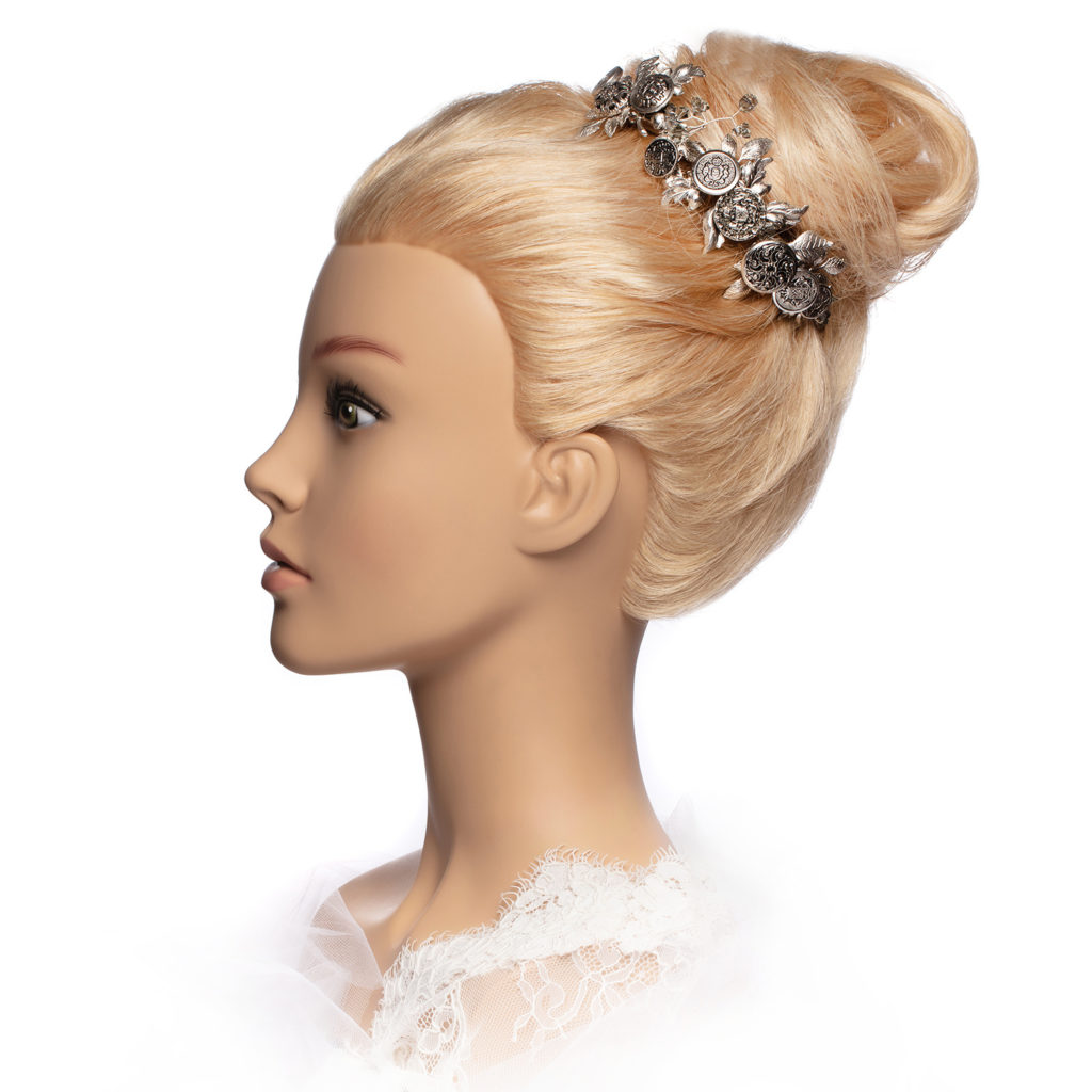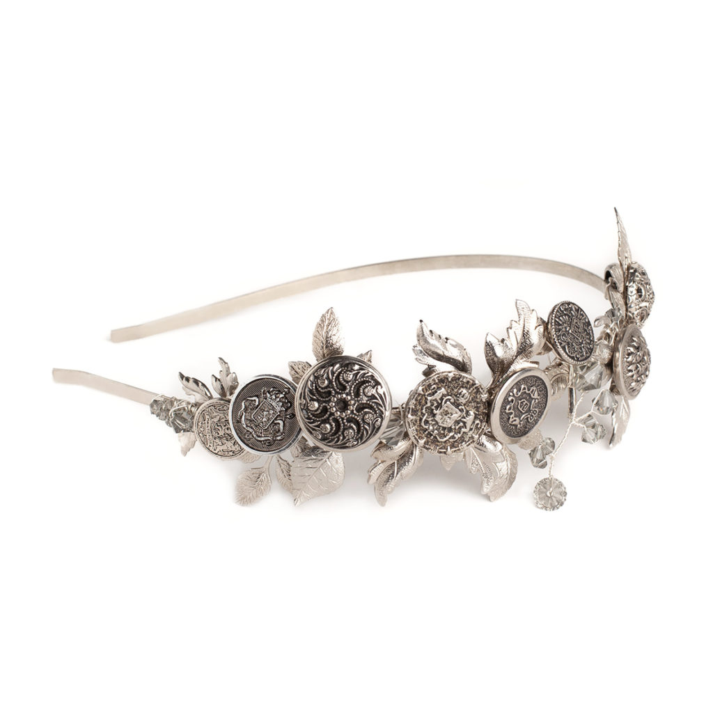Introducing the Regal Heirloom headband – a true showstopper that defies description with its antique-inspired beauty. This gorgeous creation features silver-plated brass leaves and distinctive antique buttons sourced from a private collection. Each headband is a unique masterpiece, showcasing a different variety of buttons that are both original and one-of-a-kind. This headband exudes an air of royalty and history, serving as a dramatic and captivating beauty in its original creation.