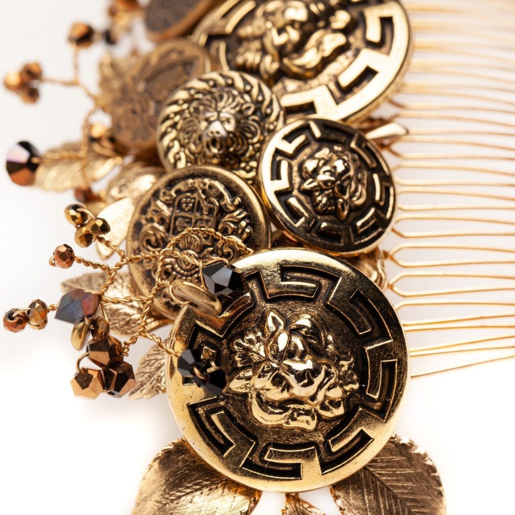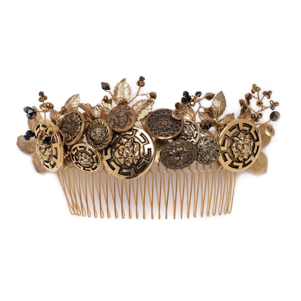 Nestled within an antique gold framework, the comb is adorned with a symphony of intricately fashioned leaves and sprays, meticulously adorned with Austrian crystals, beads, and disks in earthy tones of gold, bronze, and earth-brown. Every element is thoughtfully chosen to evoke the lush palette of nature and the enduring grace of heraldic symbolism.