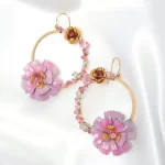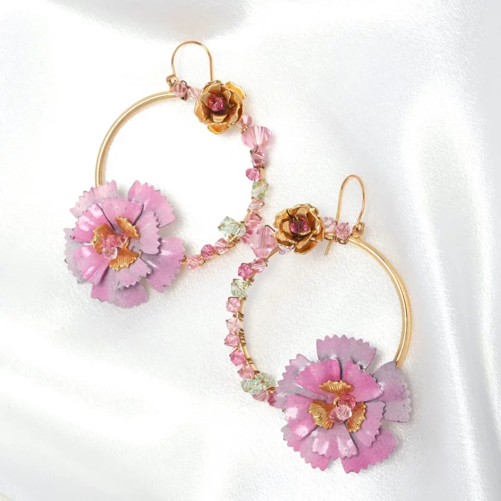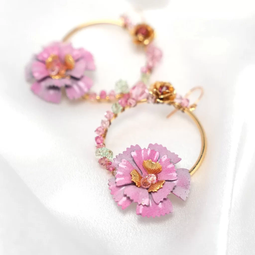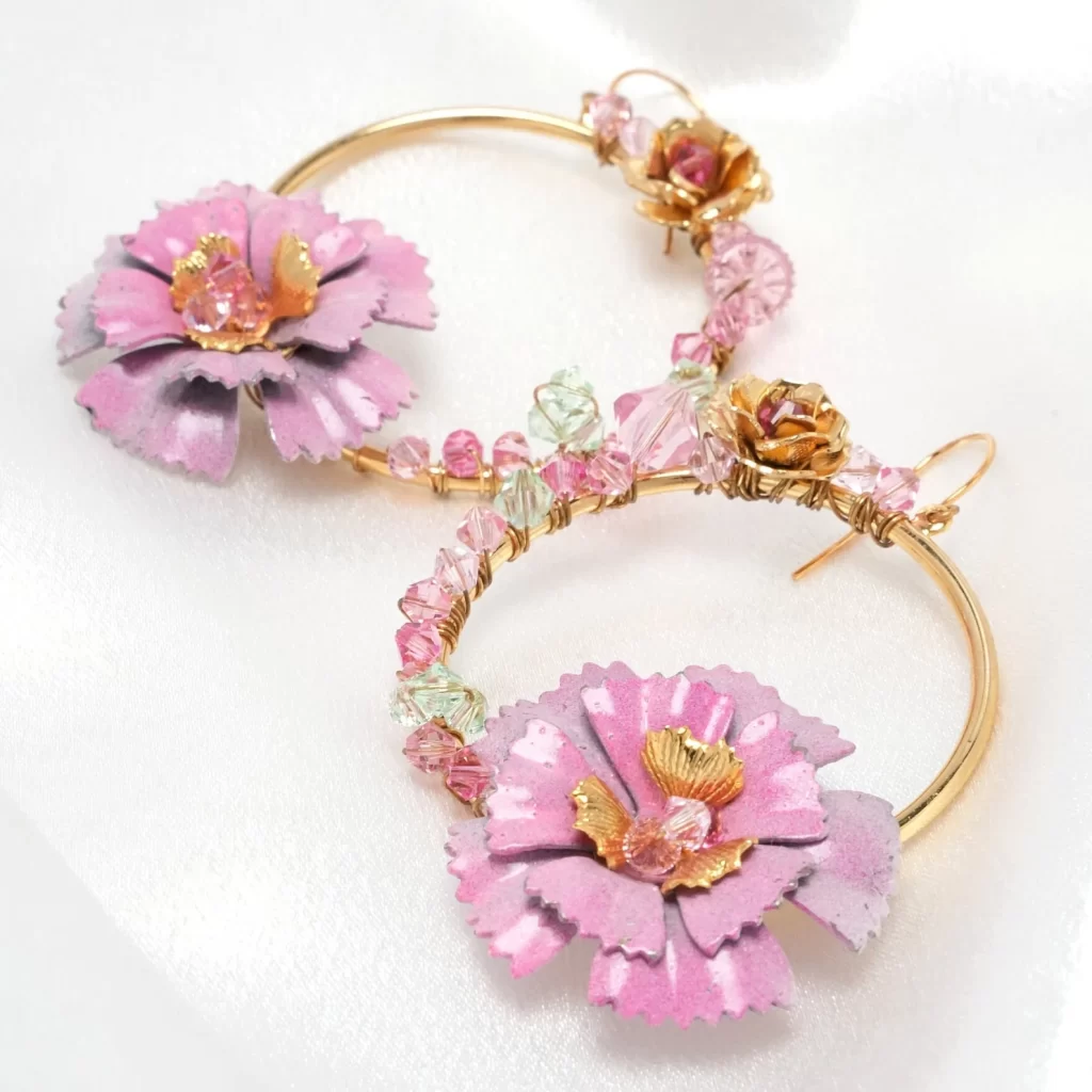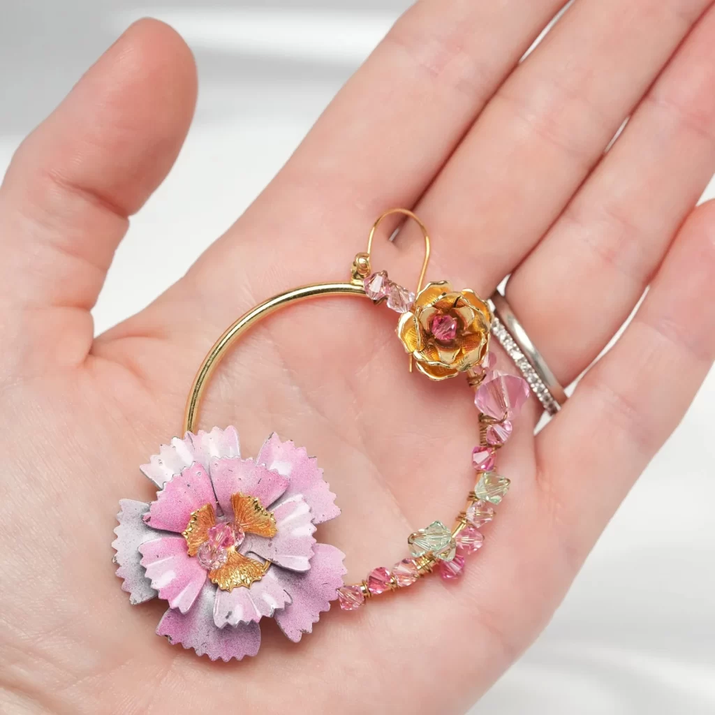 At the heart of these earrings lies a large rustic vintage layered bloom, meticulously crafted with an enchanting ombre of pinks, reminiscent of a romantic garden in full bloom.
