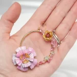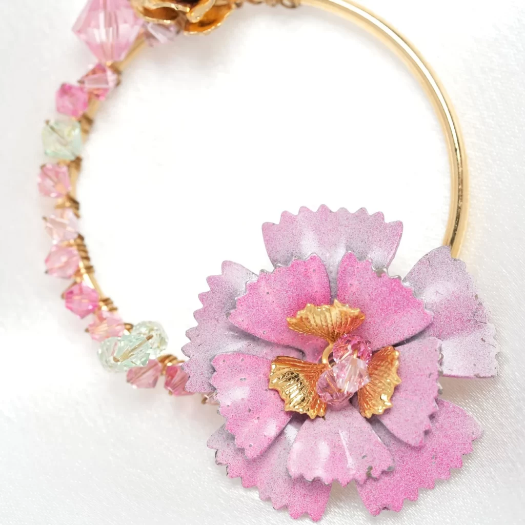 Prepare to be mesmerized by this exquisite design! Suspended delicately on a 24-karat gold plated loop, these earrings feature Austrian crystals in chrysolite, rose, and light rose shades, evoking the beauty of blooming spring and warm summer days.