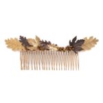 Crafted from an array of antique gold-plated oak and maple leaves, along with copper ox-plated leaves, this comb encapsulates the essence of the fall season with its rich tones and intricate craftsmanship. Each leaf is meticulously hand-wired onto a golden comb, forming a mesmerizing arrangement reminiscent of the stunning fall foliage.