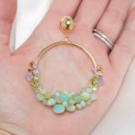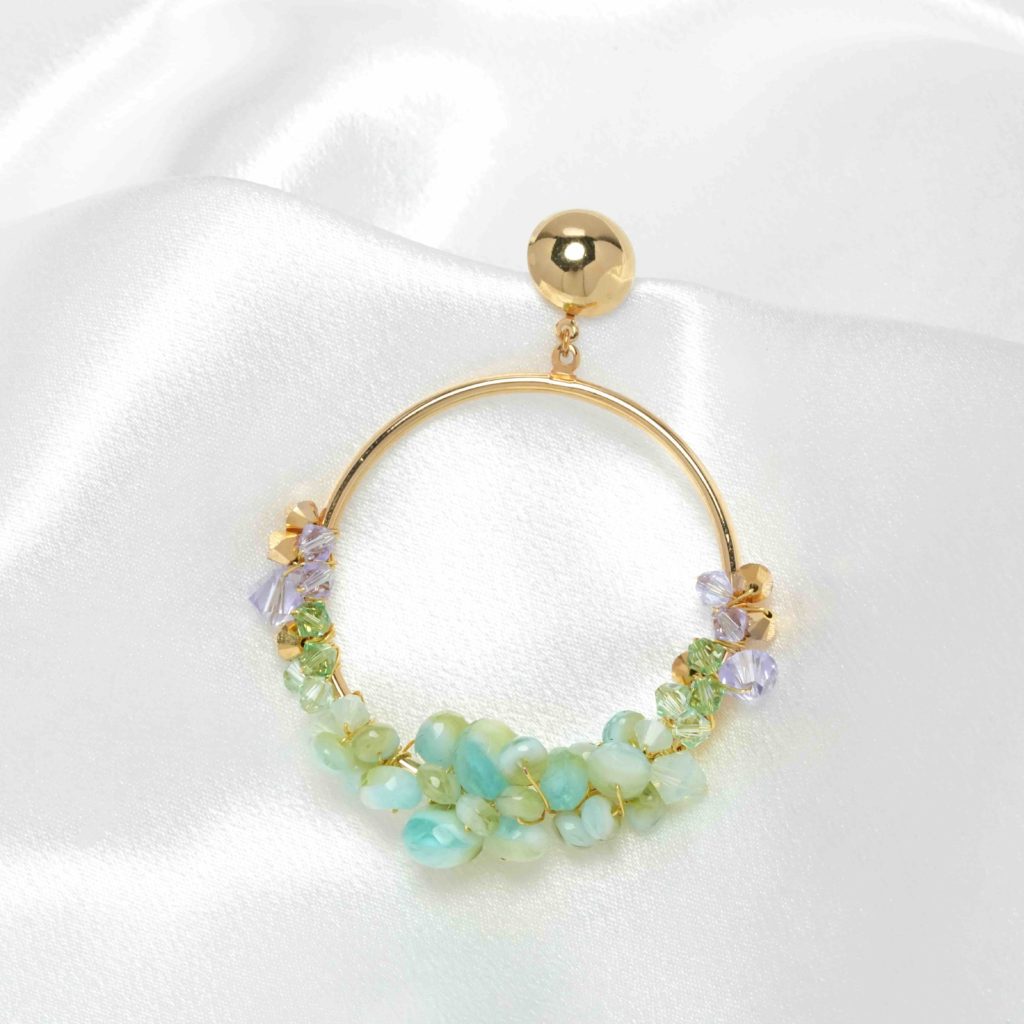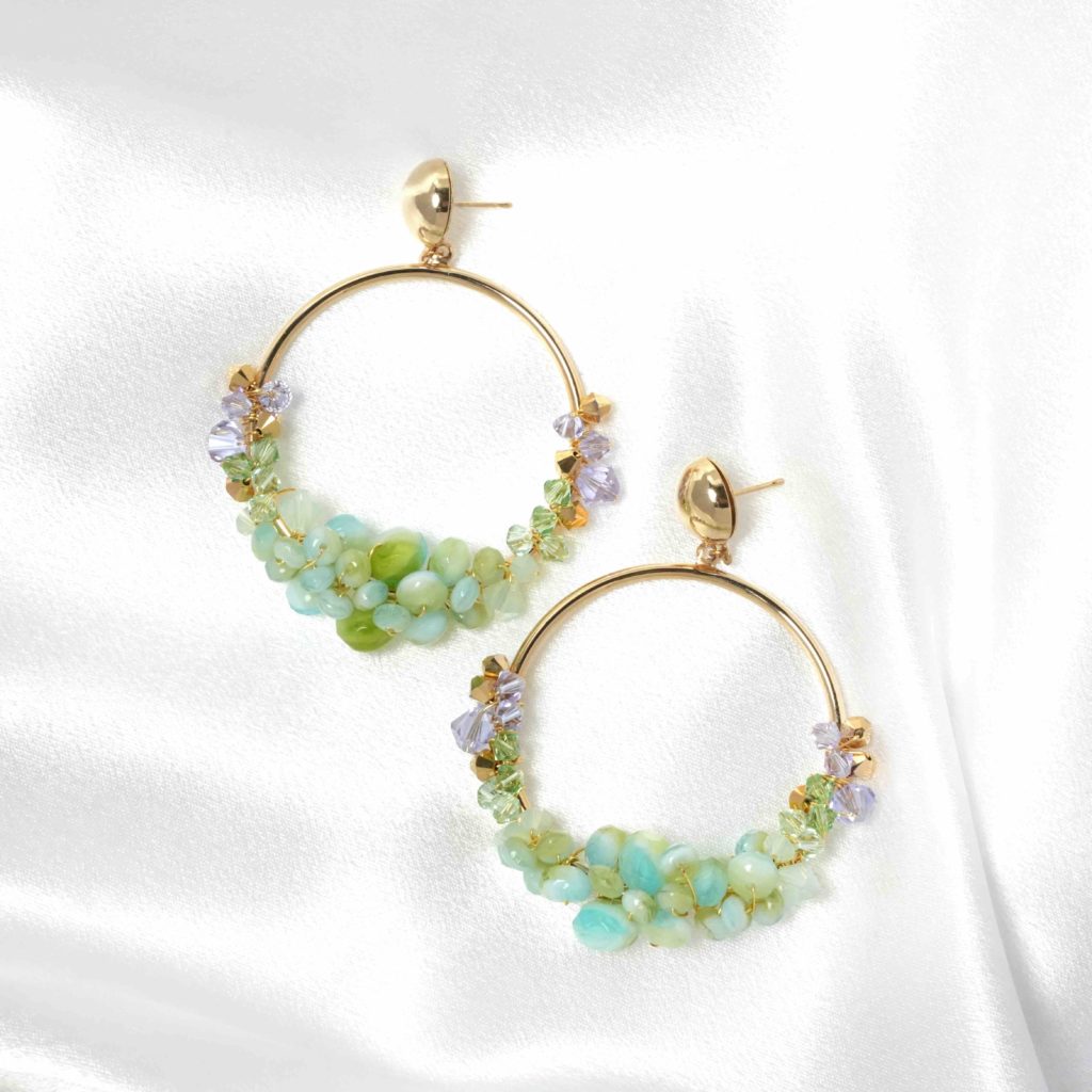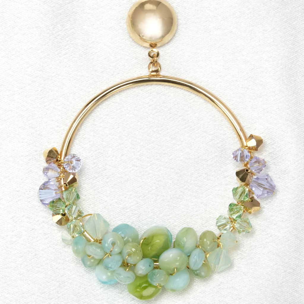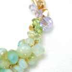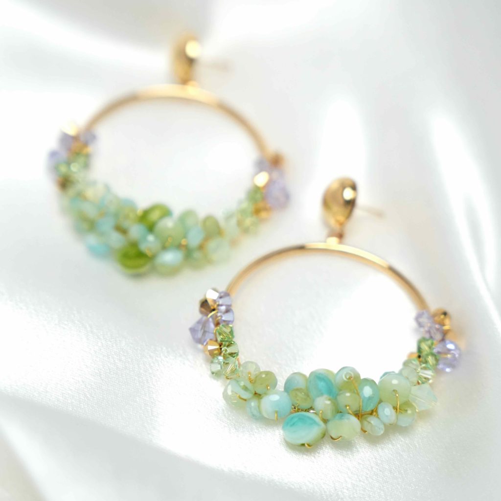 The clusters of beads, along with Austrian crystals in ocean hues of chrysolite, chrysolite opal, peridot, gold aura, and violet, create a stunning visual effect that is both captivating and elegant.