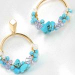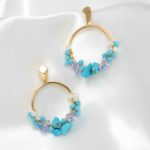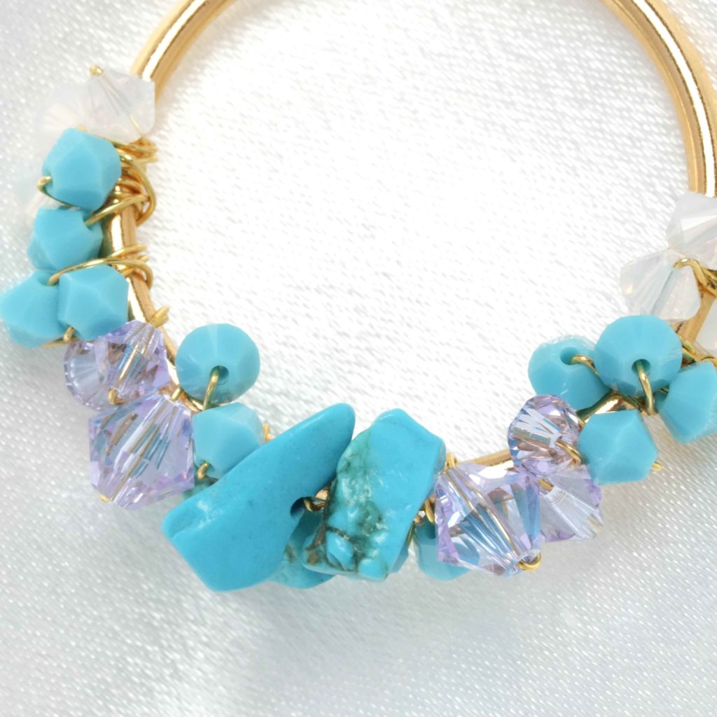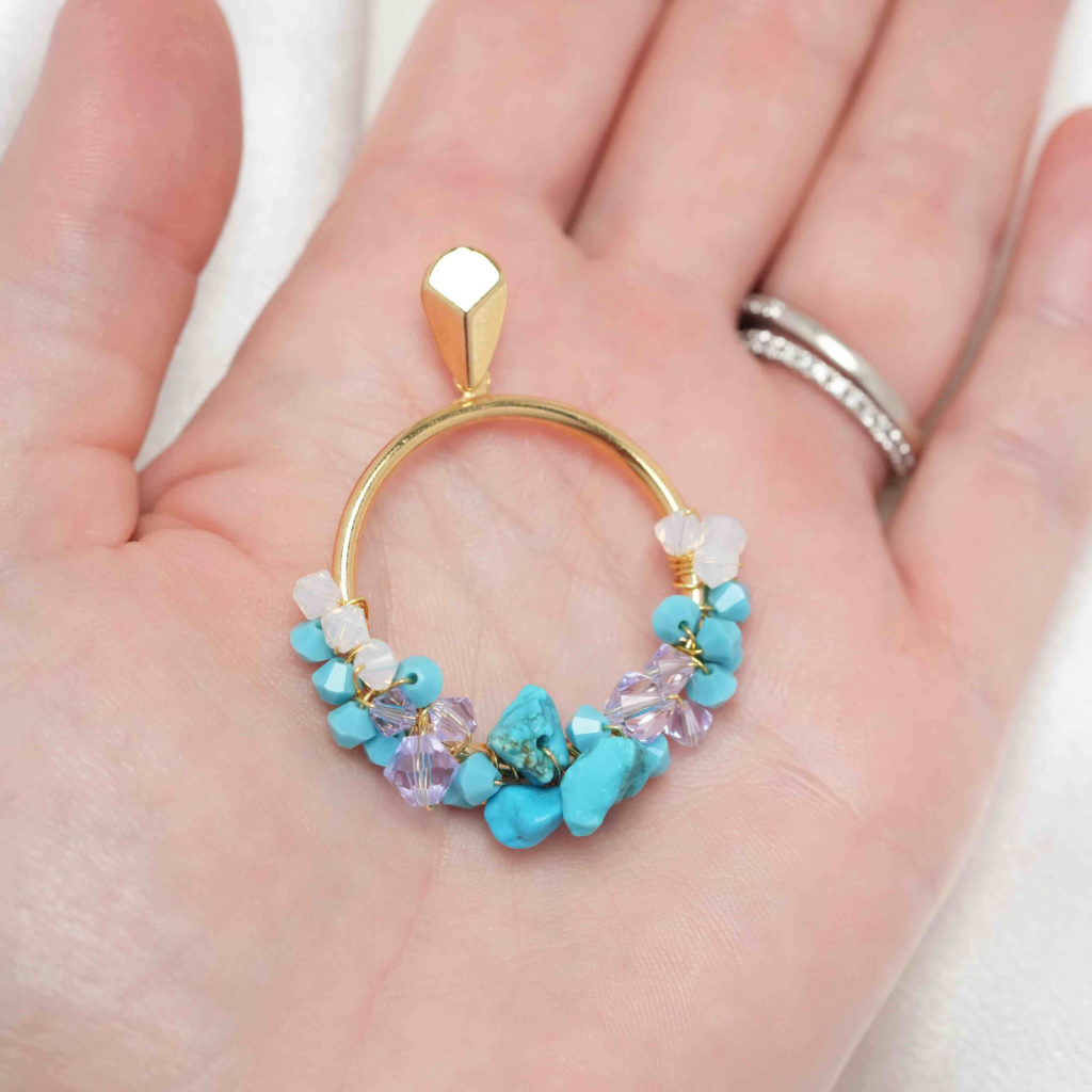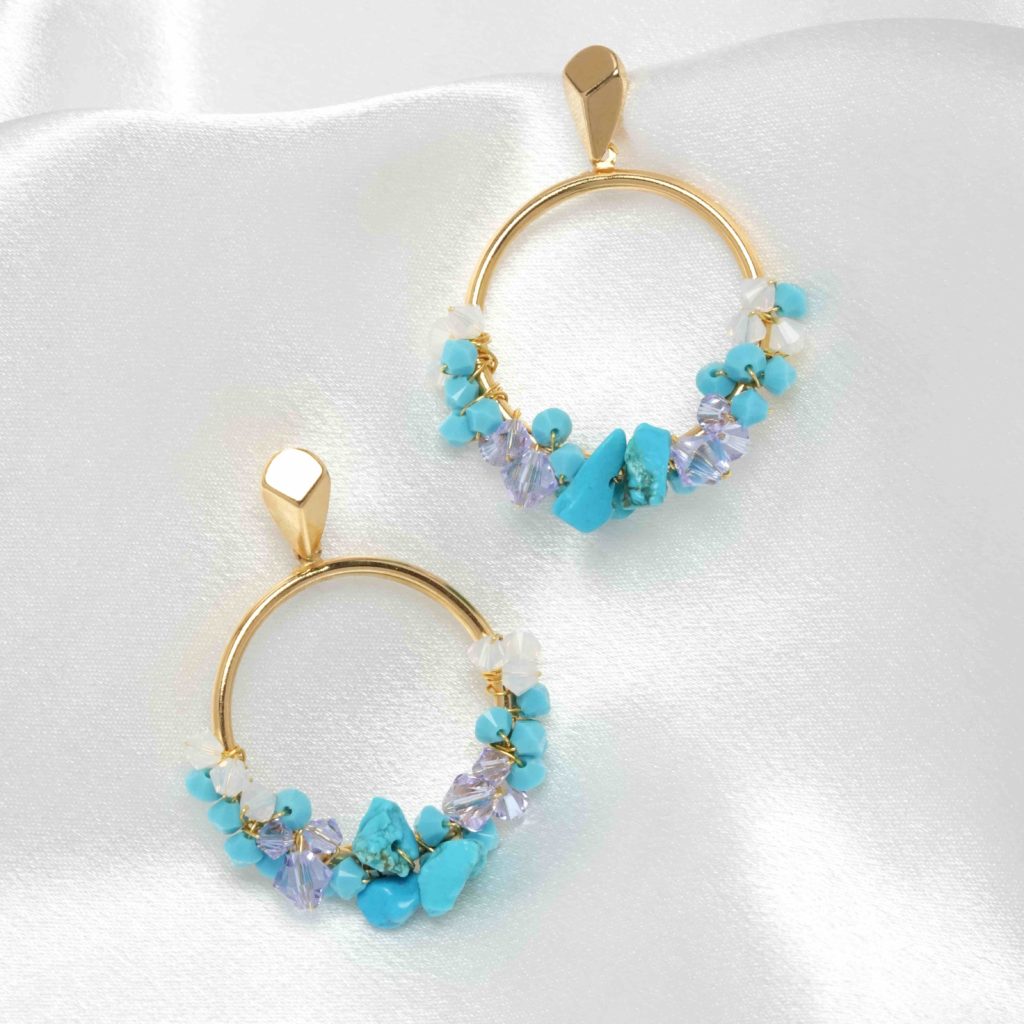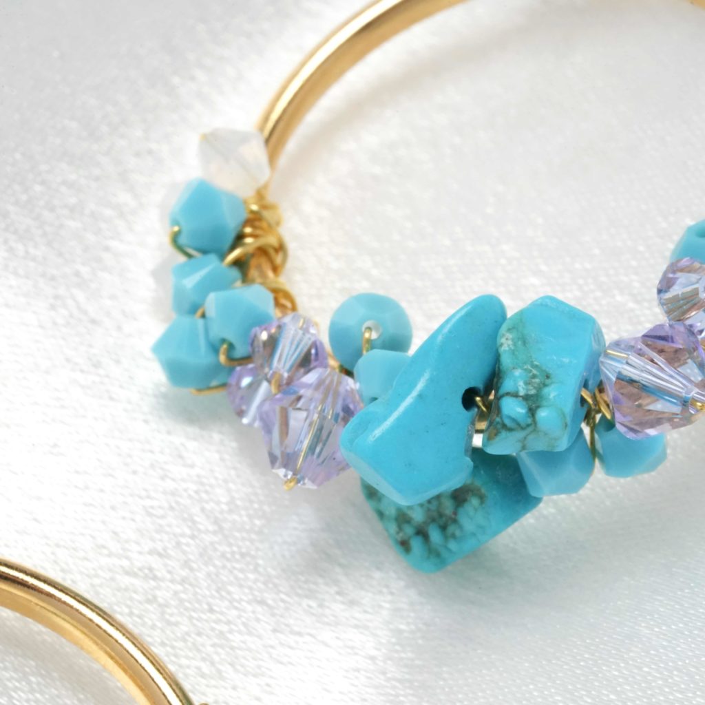 Indulge in the allure of the ocean with these captivating medium-sized earrings. Crafted with natural turquoise, each delicate stone is meticulously hand-wired onto swaying loops adorned with Austrian crystals in shades of turquoise, violet, and white opal, evoking the mesmerizing hues of the sea.