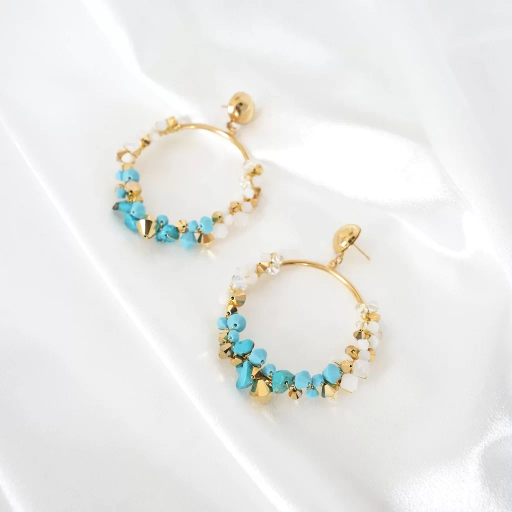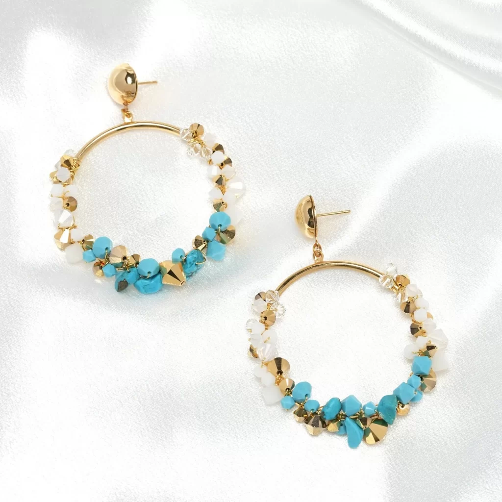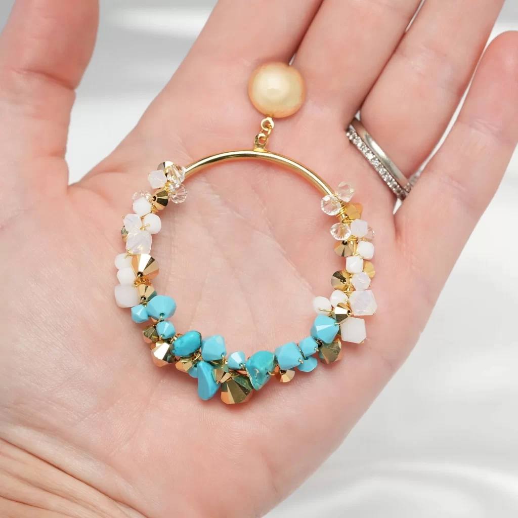 Introducing truly statement earrings, a captivating fusion of elegance and nature's beauty. These large, gorgeous loops feature a gold-plated base meticulously hand-wired with Austrian crystals and turquoise stones, exuding opulence and charm.