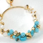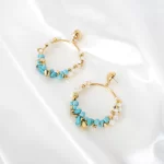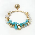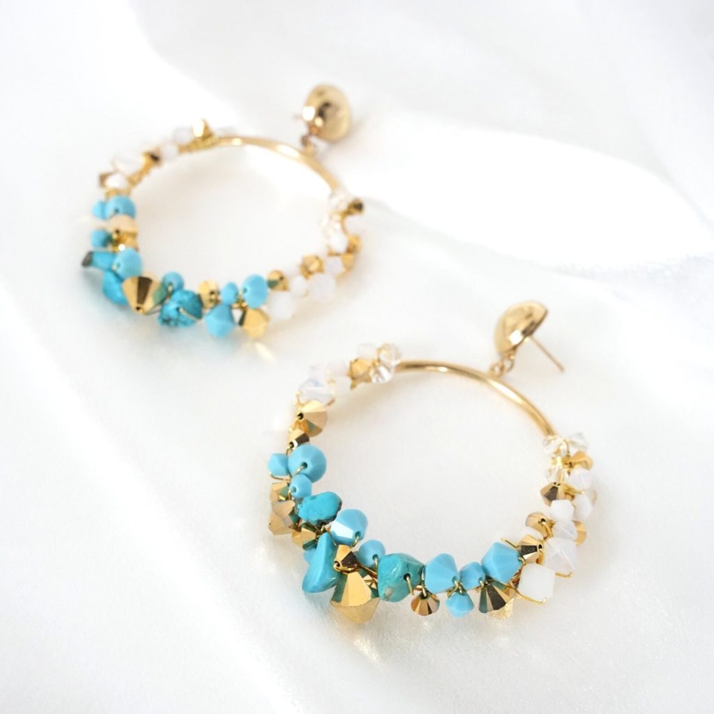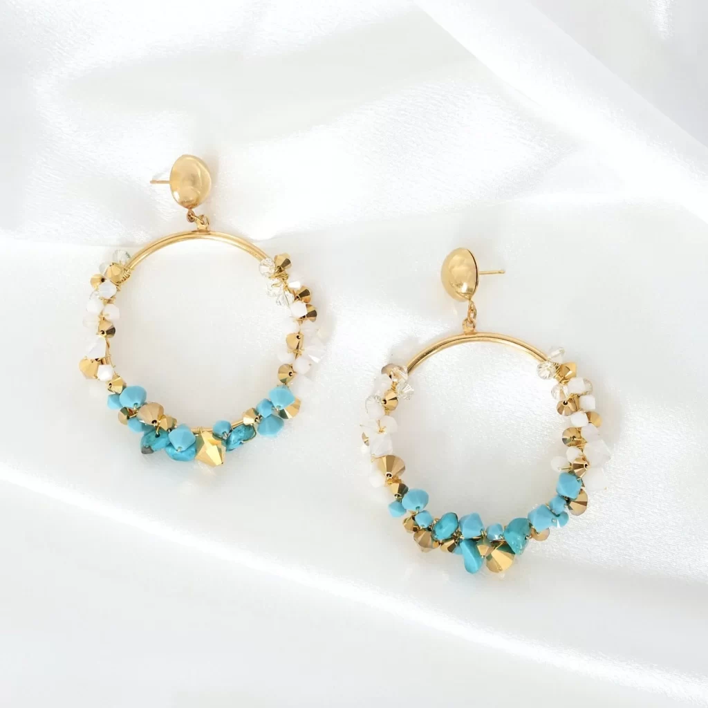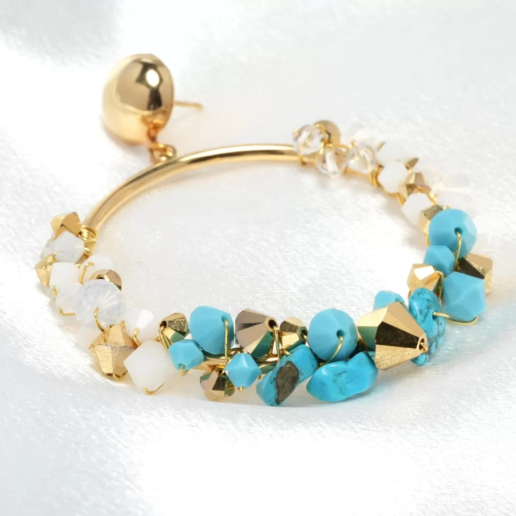 Introducing truly statement earrings, a captivating fusion of elegance and nature's beauty. These large, gorgeous loops feature a gold-plated base meticulously hand-wired with Austrian crystals and turquoise stones, exuding opulence and charm.