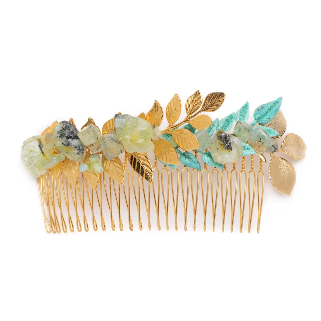 Nestled amidst shimmering golden leaves plated in 24-karat gold, the focal point of this headpiece is the captivating prehnite quartz. Renowned for its mystical properties and its ability to draw luck from nature, prehnite quartz infuses this comb with an aura of magic and wonder.